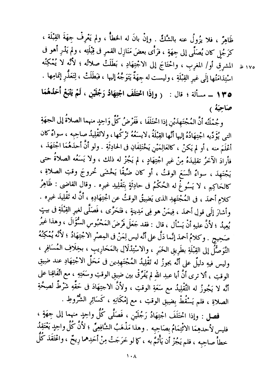 وجُمْلَتُه أنَّ المُجْتَهِدَيْنِ إذا اخْتَلَفَا، فَفَرْضُ كُلِّ وَاحِدٍ منهما الصلاةُ إلى الجهَةِ التي يُؤَدِّيه اجْتِهَادُهُ إليها أنَّها القِبْلَةُ، لا يسَعُهُ تَرْكُها، ولا تَقْلِيدُ صاحِبِه، سواءٌ كان أعْلَمَ منه، أو لم يَكنْ، كالعَالِمَيْنِ يَخْتَلِفَانِ في الحادِثَةِ. ولو أنَّ أحدَهُمَا اجْتَهَدَ، فأرادَ الآخَرُ تقلِيدَهُ مِنْ غيرِ اجْتِهَادٍ، لم يَجُزْ له ذلك، ولا يَسَعُه الصلاةُ حتى يَجْتَهِدَ، سواءٌ اتَّسَعَ الوقتُ، أو كان ضيِّقًا يَخْشَى خُروجَ وقتِ الصلاةِ، كالحَاكِمِ، لا يَسُوغُ له الحُكْمُ في حادِثَةٍ بِتَقْلِيدِ غيرِه. وقال القاضي: ظَاهِرُ كلامِ أحمدَ، في المُجْتَهِدِ الذي يَضِيقُ الوقتُ عن اجْتِهَادِهِ، أنَّ له تَقْلِيدَ غيرِه. وأشارَ إلَى قولِ أحمدَ، فِيمَنْ هو في مَدِينةٍ، فتَحَرَّى، فَصَلَّى لغيرِ القِبْلَةِ في بيتٍ يُعِيدُ؛ لأنَّ عليهِ أنْ يَسْأل، قال: فقد جَعَلَ فَرْضَ المَحْبُوسِ السُّؤَالَ، وهذا غيرُ صَحِيحٍ. وكلامُ أحمدَ إنَّما دَلَّ على أنَّه ليس لِمَنْ في المِصْرِ الاجْتِهَادُ؛ لأنَّه يُمْكِنُهُ التَّوَصُّلُ إلى القِبْلَةِ بطَرِيقِ الخَبَرِ، والاسْتِدْلَالِ بالمَحَارِيبِ، بخِلَافِ المُسَافِرِ، وليس فيهِ دليلٌ على أنَّه يجوزُ له تَقْلِيدُ المُجْتَهِدِين في مَحَلِّ الاجْتِهَادِ عند ضِيقِ الوقتِ، ألا ترى أنَّ أبا عبدِ اللَّه لم يُفَرِّقْ بين ضِيقِ الوقتِ وسَعَتِهِ، مع اتِّفَاقِنا على أنَّه لا يَجُوزُ له التَّقْلِيدُ مع سَعَةِ الوقتِ، ولأنَّ الاجتِهَادَ في حَقِّهِ شَرْطٌ لصِحَّةِ الصلاةِ، فلم يَسْقُطْ بِضِيقِ الوقتِ، مع إمْكَانِهِ، كَسَائِرِ الشُّرُوطِ.