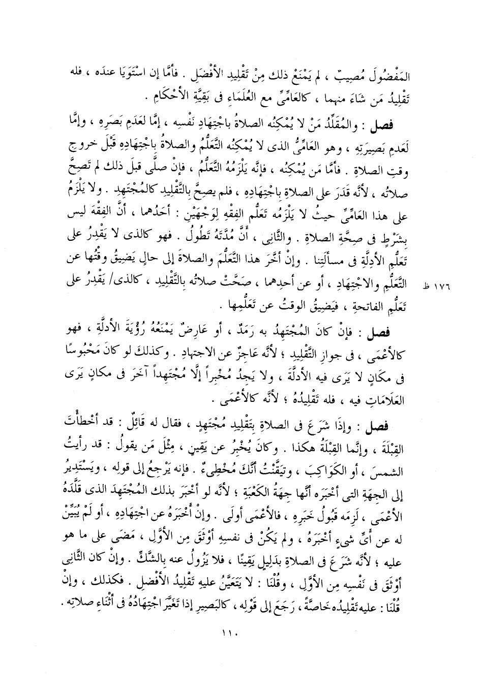 فصل: والمُقَلِّدُ مَنْ لا يُمْكِنُه الصلاةُ باجْتِهَادِ نَفْسِه، إمَّا لعَدَمَ بَصَرِهِ، وإمَّا لَعَدمِ بَصِيرَتِهِ، وهو العَامِّىُّ الذي لا يُمْكِنُه التَّعَلُّمُ والصلاةُ بِاجْتِهَادِهِ قَبْلَ خروجِ وقتِ الصلاةِ. فأمَّا مَن يُمْكِنُه، فإنَّه يَلْزَمُهُ التَّعَلُّمُ، فإنْ صلَّى قبلَ ذلك لم تَصِحَّ صلاتُه، لأنَّه قَدَرَ على الصلاةِ بِاجْتِهَادِهِ، فلم يصِحَّ بِالتَّقْلِيدِ كالمُجْتَهِدِ. ولا يَلْزَمُ على هذا العَامِّىِّ حيثُ لا يَلْزَمُه تَعَلُّم الفِقْهِ لِوَجْهَيْنِ: أحَدُهما، أنَّ الفِقْهَ ليس بِشَرْطٍ في صِحَّةِ الصلاةِ. والثَّانِى، أَنَّ مُدَّتَهُ تَطُولُ. فهو كالذى لا يَقْدِرُ على تَعَلُّمِ الأدِلَّةِ في مسألَتِنا. وإنْ أخَّرَ هذا التَّعَلُّمَ والصلاةَ إلى حالٍ يَضِيقُ وقْتُها عن التَّعَلُّمِ والاجْتِهَادِ، أو عن أحدِهما، صَحَّتْ صلاتُه بِالتَّقْلِيدِ، كالذى يَقْدِرُ على تَعَلُّمِ الفاتحةِ، فيَضِيقُ الوقتُ عن تَعَلُّمِها.