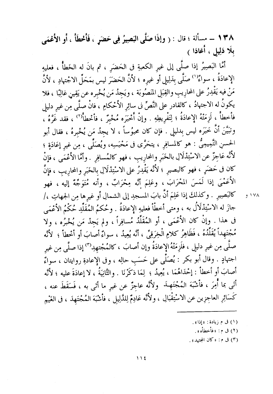 ١٣٨ - مسألة؛ قال: (وإذَا صَلَّى البَصِيرُ في حَضَرٍ، فَأَخْطَأَ، أَو الأَعْمَى بِلَا دَلِيلٍ، أَعَادَا)