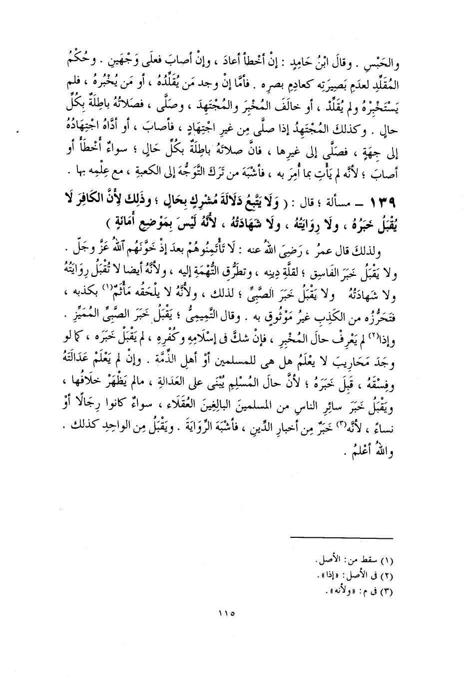 ١٣٩ - مسألة؛ قال: (وَلَا يَتَّبِعُ دَلَالَةَ مُشْرِكٍ بِحَالٍ؛ وذَلِكَ لِأَنَّ الكَافِرَ لَا يُقْبَلُ خَبَرُهُ، ولَا رِوَايَتُهُ، ولَا شَهَادَتُهُ، لأَنَّهُ لَيْسَ بِمَوْضِعِ أَمَانَةٍ)