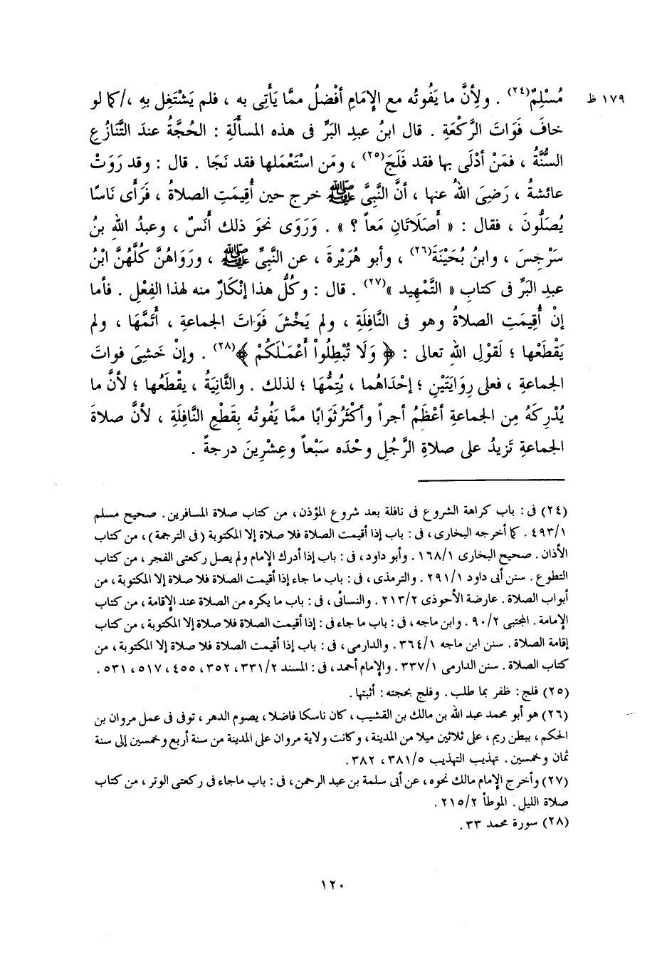 مُسْلِمٌ (٢٤). ولِأنَّ ما يَفُوتُه مع الإِمَامِ أفْضلُ ممَّا يَأَتِى به، فلم يَشْتَغِل بهِ، كما لو خافَ فَوَاتَ الرَّكْعَةِ. قال ابنُ عبدِ البَرِّ في هذه المسأَلَةِ: الحُجَّةُ عندَ التنَّازُعِ السُّنَّةُ، فمَنْ أدْلَى بها فقد فَلَجَ (٢٥)، ومَن اسْتَعْمَلها فقد نَجَا. قال: وقد رَوَتْ عائشةُ، رَضِىَ اللهُ عنها، أنَّ النَّبِىَّ -صلى اللَّه عليه وسلم- خرج حين أُقِيمَتِ الصلاةُ، فَرَأَى نَاسًا يُصَلُّونَ، فقال: "أَصَلَاتَانِ مَعًا؟ ". وَرَوَى نحوَ ذلك أَنَسٌ، وعبدُ اللَّه بنُ سَرْجِسَ، وابنُ بُحَيْنَةَ (٢٦)، وأبو هُرَيْرةَ، عن النَّبِيِّ -صلى اللَّه عليه وسلم-، ورَوَاهُنَّ كُلَّهُنَّ ابْنُ عبدِ البَرِّ في كتابِ "التَّمْهِيد" (٢٧). قال: وكُلُّ هذا إنْكَارٌ منه لهذا الفِعْلِ. فأما إنْ أُقِيمَتِ الصلاةُ وهو في النَّافِلَةِ، ولم يَخْشَ فَوَاتَ الجماعةِ، أَتَمَّهَا، ولم يَقْطَعْها؛ لَقوْلِ اللَّه تعالى: {وَلَا تُبْطِلُوا أَعْمَالَكُمْ} (٢٨). وإنْ خَشِىَ فواتَ الجماعةِ، فعلى رِوَايَتَيْنِ؛ إحْدَاهُما، يُتِمُّهَا؛ لذلك. والثَّانِيَةُ، يقْطَعُها؛ لأنَّ ما يُدْرِكَهُ مِن الجماعةِ أعْظَمُ أجرًا وأكْثَرُ ثَوَابًا ممَّا يَفُوتُه بِقَطْعِ النَّافِلَةِ، لأنَّ صلاةَ الجماعةِ تَزيدُ على صلاةِ الرَّجُلِ وحْدَه سَبْعًا وعِشْرِينَ درجةً.