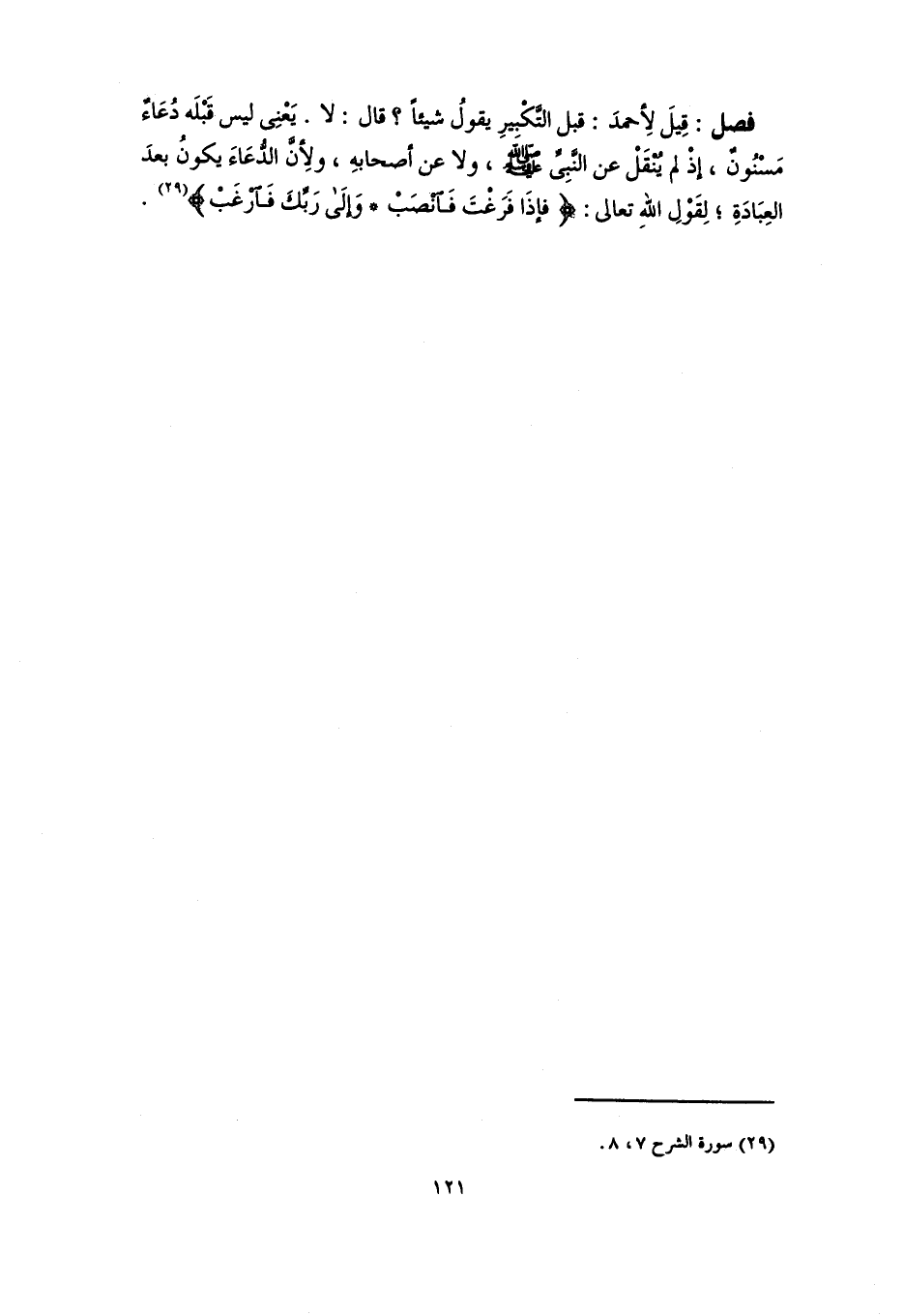 فصل: قِيلَ لِأحمدَ: قبل التَّكْبِيرِ يقولُ شيئًا؟ قال: لا. يَعْنِى ليس قَبْلَه دُعَاءٌ مَسْنُونٌ، إذْ لم يُنْقَلْ عن النَّبِيِّ -صلى اللَّه عليه وسلم-، ولا عن أصحابهِ، ولِأنَّ الدُّعَاءَ يكونُ بعدَ العِبَادَةِ؛ لِقَوْلِ اللهِ تعالى: {فَإِذَا فَرَغْتَ فَانْصَبْ (٧) وَإِلَى رَبِّكَ فَارْغَبْ} (٢٩).