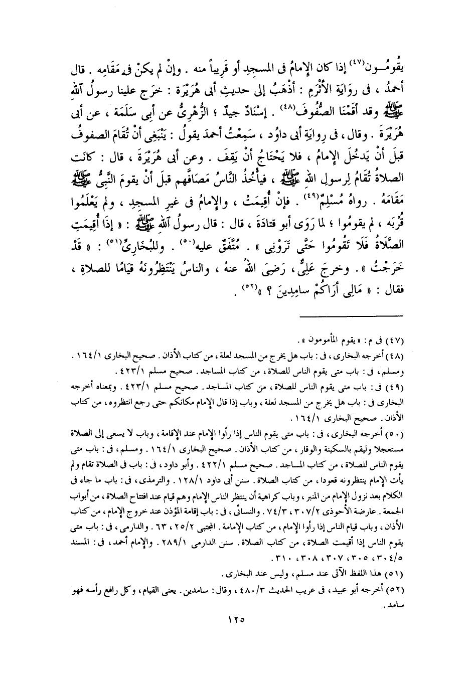 (٥٠) أخرجه البخاري، في: باب متى يقوم الناس إذا رأوا الإمام عند الإقامة، وباب لا يسعى إلى الصلاة مستعجلا وليقم بالسكينة والوقار، من كتاب الأذان. صحيح البخاري ١/ ١٦٤. ومسلم، في: باب متى يقوم الناس للصلاة، من كتاب المساجد. صحيح مسلم ١/ ٤٢٢. وأبو داود، في: باب في الصلاة تقام ولم يأت الإمام ينتظرونه قعودا، من كتاب الصلاة. سنن أبي داود ١/ ١٢٨. والترمذي، فى: باب ما جاء في الكلام بعد نزول الإمام من المنبر، وباب كراهية أن ينتظر الناس الإمام وهم قيام عند افتتاح الصلاة، من أبواب الجمعة. عارضة الأحوذي ٢/ ٣٠٧، ٣/ ٧٤. والنسائي، في: باب إقامة المؤذن عند خروج الإمام، من كتاب الأذان، وباب قيام الناس إذا رأوا الإمام، من كتاب الإمامة. المجتبى ٢/ ٢٥، ٦٣. والدارمي، في: باب متى يقوم الناس إذا أقيمت الصلاة، من كتاب الصلاة. من الدارمي ١/ ٢٨٩. والإمام أحمد، في: المسند ٥/ ٣٠٤، ٣٠٥، ٣٠٧، ٣٠٨، ٣١٠.