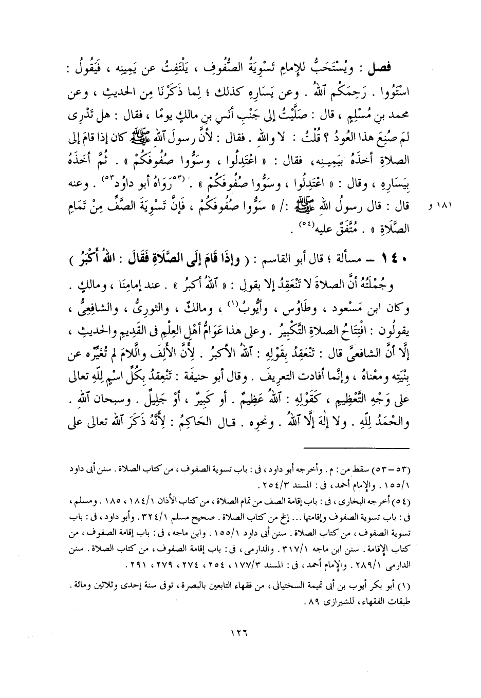 فصل: ويُسْتَحَبُّ للإِمامِ تَسْوِيَةُ الصُّفُوفِ، يَلْتَفِتُ عن يَمِينِه، فَيَقُولُ: اسْتَوُوا. رَحِمَكُم اللهُ. وعن يَسَارِهِ كذلك؛ لِما ذَكَرْنَا مِن الحديثِ، وعن محمد بنِ مُسْلِمٍ، قال: صَلَّيْتُ إلى جَنْبِ أنَسِ بنِ مالكٍ يومًا، فقال: هل تَدْرِى لمَ صُنِعَ هذا العُودُ؟ قُلْتُ: لا واللهِ. فقال: لأنَّ رسولَ اللهِ -صلى اللَّه عليه وسلم- كان إذا قامَ إلى الصلاةِ أخذَهُ بيَمِينِه، فقال: "اعْتَدِلُوا، وسَوُّوا صُفُوفَكُمْ". ثُمَّ أخَذَهُ بِيَسَارِهِ، وقال: "اعْتَدِلُوا، وسَوُّوا صُفُوفَكُمْ". [رَوَاهُ أبو داوُد] (٥٣). وعنه قال: قال رسولُ اللهِ -صلى اللَّه عليه وسلم-: "سَوُّوا صُفُوفَكُمْ، فَإنَّ تَسْوِيَةَ الصَّفِّ مِنْ تَمَامِ الصَّلَاةِ". مُتَّفَقٌ عليه (٥٤).