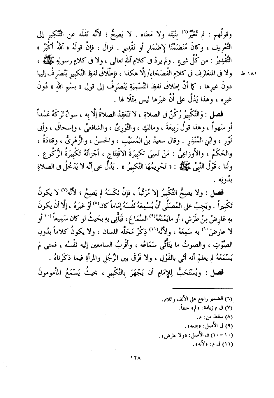 فصل: ولا يصِحُّ التَّكْبِيرُ إلا مُرَتَّبًا، فإنْ نَكَسَهُ لم يَصِحَّ؛ لأنَّه (٧) لا يكونُ تَكْبِيرًا. ويَجِبُ على المُصَلِّى أنْ يُسْمِعَهُ نَفْسَهُ إمَامًا كان (٨) أوْ غيرَهُ، إلَّا أنْ يكونَ بهِ عَارِضٌ مِنْ طَرَشٍ، أو ما يَمْنَعُهُ (٩) السَّمَاعَ، فَيَأْتِى بهِ بحَيثُ لو كان سَمِيعًا [أو لا عارضَ] (١٠) به سَمِعَهُ، ولأنَّه (١١) ذِكْرٌ مَحَلَّه اللسان، ولا يكونُ كلامًا بدُونِ الصَّوْتِ، والصوتُ ما يتَأَتَّى سَمَاعُه، وأقْربُ السامعين إليه نَفْسُه، فمتى لم يَسْمَعْهُ لم يعلمْ أنه أتَى بالقَوْلِ، ولا فَرْقَ بين الرَّجُلِ والمرأةِ فيما ذكَرْناهُ.