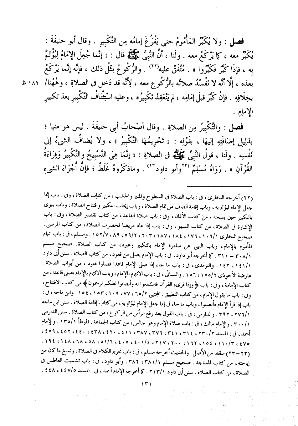 فصل: والتَّكْبِيرُ مِن الصلاةِ. وقال أصْحابُ أبِى حنيفَةَ. ليس هو منها؛ بدَلِيلِ إضَافَتِهِ إليهَا، بقَوْلِه: "تَحْرِيمُهَا التَّكْبِيرُ"، ولا يُضافُ الشىءُ إلى نَفْسِه. ولَنا، قولُ النَّبِيِّ -صلى اللَّه عليه وسلم- في الصلاةِ: "إنَّمَا هِىَ التَّسْبِيحُ والتَّكْبِيرُ وَقِرَاءَةُ القُرْآنِ". رَوَاهُ مُسْلِمٌ [وأبو داود] (٢٣). وما ذكَرُوهُ غَلَطٌ؛ فإنَّ أَجْزَاءَ الشيءِ