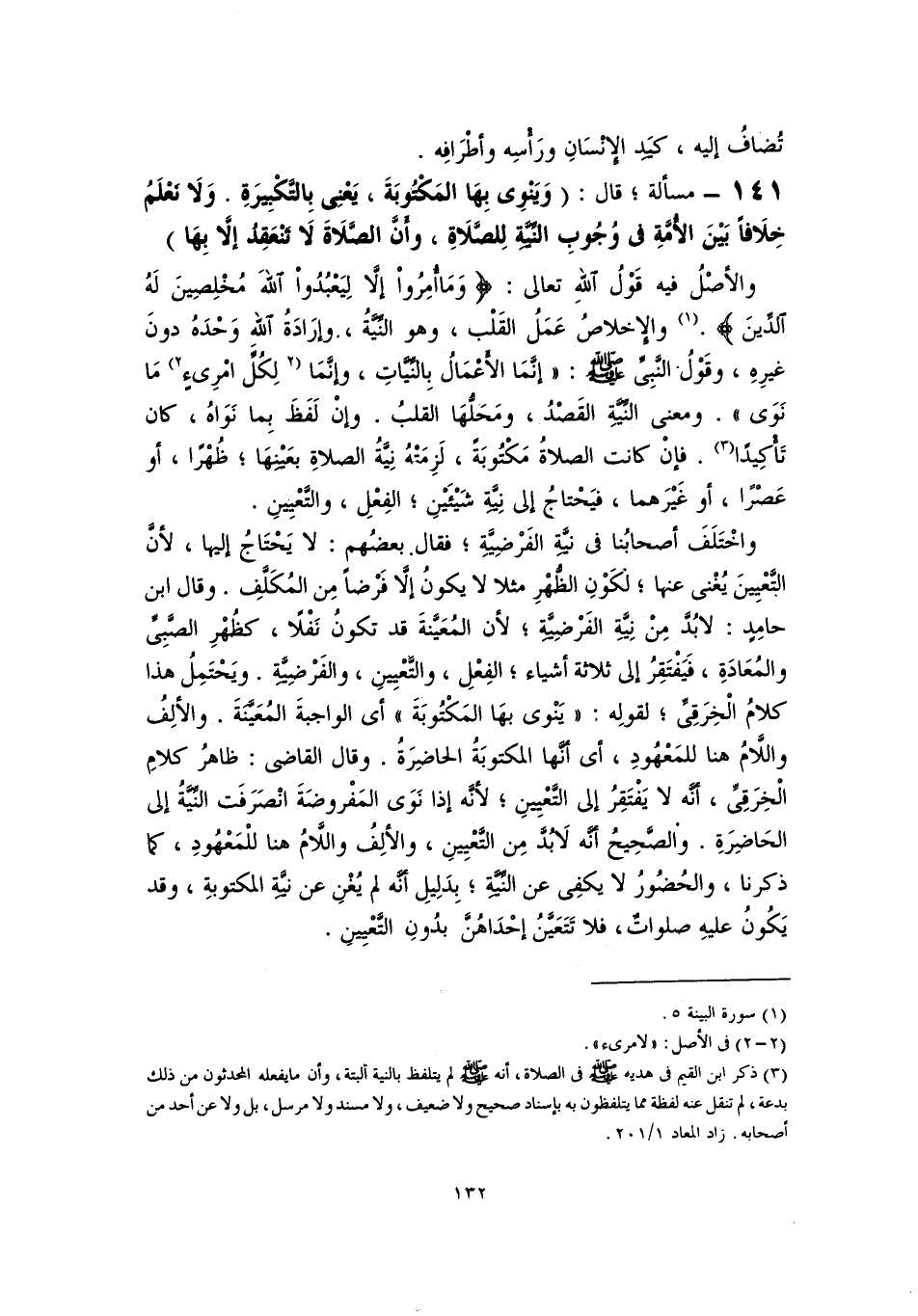 (٣) ذكر ابن القيم في هديه -صلى اللَّه عليه وسلم- في الصلاة، أنه -صلى اللَّه عليه وسلم- لم يتلفظ بالنية ألبتة، وأن ما يفعله المحدثون من ذلك بدعة، لم تنقل عنه لفظة مما يتلفظون به بإسناد صحيح ولا ضعيف، ولا مسند ولا مرسل، بل ولا عن أحد من أصحابه. زاد المعاد ١/ ٢٠١.