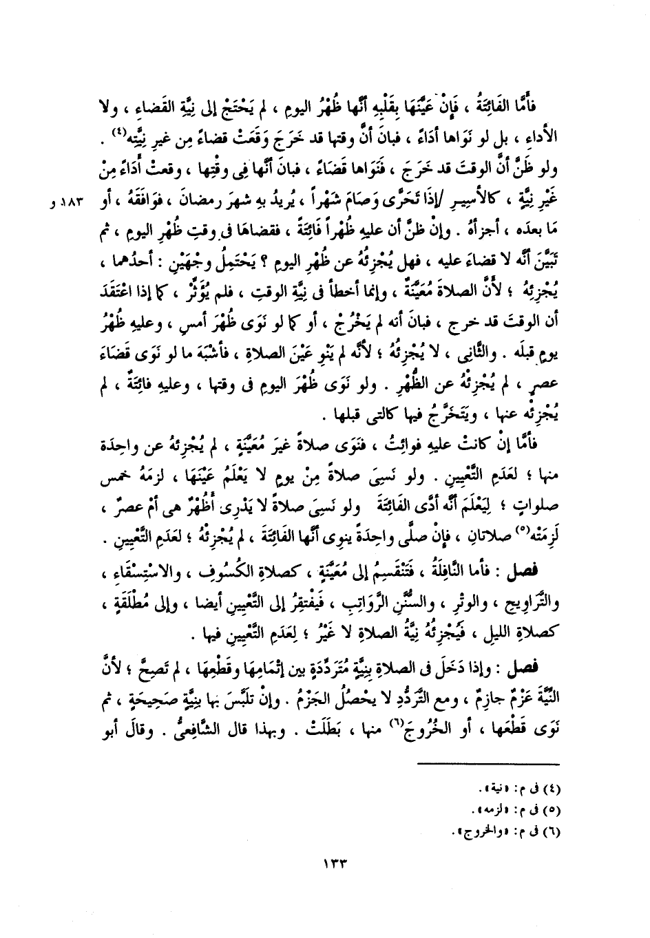 فأَمَّا الفَائِتَةُ، فَإنْ عَيَّنَهَا بِقَلْبِهِ أنَّها ظُهْرُ اليومِ، لم يَحْتَجْ إلى نِيَّةِ القَضاءِ، ولا الأداءِ، بل لو نَوَاها أدَاءً، فبانَ أنَّ وقتها قد خَرَجَ وَقَعَتْ قضاءً مِن غيرِ نِيَّتِه (٤). ولو ظَنَّ أنَّ الوقتَ قد خَرَجَ، فَنَوَاها قَضَاءً، فبان أنَّها في وقْتِها، وقعتْ أَدَاءً مِنْ غَيْرِ نِيَّةٍ، كالأسِيرِ إذَا تَحَرَّى وَصَامَ شَهْرًا، يُريدُ بهِ شهرَ رمضانَ، فوَافَقَهُ، أو مَا بعدَه، أجزأهُ. وإنْ ظنَّ أن عليهِ ظُهْرًا فَائِتَةً، فقضاهَا في وقتِ ظُهْرِ اليومِ، ثم تَبَيَّنَ أنَّه لا قضاءَ عليه، فهل يُجْزِئُهُ عن ظُهْرِ اليومِ؟ يَحْتَمِلُ وجْهَيْنِ: أحدُهما، يُجْزِئهُ؛ لأَنَّ الصلاةَ مُعَيَّنَةٌ، وإنما أخطأ في نِيَّةِ الوقتِ، فلم يُؤَثِّرْ، كما إذا اعْتَقَدَ أن الوقتَ قد خرج، فبانَ أنه لم يَخْرُجْ، أو كما لو نَوَى ظُهْرَ أمس، وعليهِ ظُهْرُ يومٍ قبلَه. والثَّانِي، لا يُجْزِئُهُ؛ لأنَّه لم يَنْوِ عَيْنَ الصلاةِ، فأشْبَهَ ما لو نَوَى قَضَاءَ عصرٍ، لم يُجْزِئْهُ عن الظُّهْرِ. ولو نَوَى ظُهْرَ اليومِ في وقتها، وعليهِ فائِتَةٌ، لم يُجْزِئْه عنها، ويَتَخرَّجُ فيها كالتى قبلها.