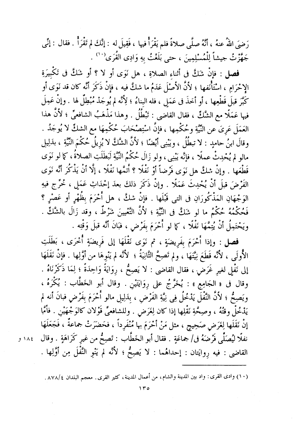 فصل: فإنْ شَكَّ في أثناءِ الصلاةِ، هل نَوَى أو لا؟ أو شَكَّ في تَكْبِيرَةِ الإِحْرَامِ، أسْتَأْنَفها؛ لأنَّ الأصْلَ عَدَمُ ما شكَّ فيه، فإِنْ ذَكَرَ أنَّه كان قد نَوَى أو كَبَّرَ قَبلَ قَطْعِها، أو أخَذَ في عَمَلٍ، فله البِناءُ؛ لِأنَّه لم يُوجَدْ مُبْطِلٌ لها. وإنْ عَمِلَ فيها عَمَلًا مع الشَّكِّ، فقال القاضي: تَبْطُلُ. وهذا مَذْهَبُ الشافعيِّ؛ لأنَّ هذا العَمَلَ عَرِىَ عن النِّيَّةِ وحُكْمِها، فإنَّ اسْتِصْحَابَ حُكْمِهَا مع الشكِّ لا يُوجَدُ. وقالَ ابنُ حامدٍ: لا تبطُلُ، ويَبْنِى أيضًا؛ لأنَّ الشَّكَّ لا يُزِيلُ حُكْمَ النِّيَّةِ، بدَلِيلِ ما لو لم يُحْدِثْ عملًا، فإنَّه يَبْنِي، ولو زَالَ حُكْمُ النِّيَّةِ لَبَطلَتِ الصلاةُ، كما لو نَوَى قَطْعَها. وإنْ شكَّ هل نَوَى فَرْضًا أوْ نَفْلًا؟ أَتمَّها نَفْلًا، إلَّا أنْ يَذْكُرَ أنَّه نَوَى الفَرْضَ قبلَ أنْ يُحْدِثَ عَمَلًا. وإنْ ذَكَرَ ذلكَ بعدَ إحْدَاثِ عَمَلٍ، خُرِّج فيهِ الوَجْهَانِ المَذْكُورَانِ في التي قَبْلَها. فإنْ شكَّ، هل أَحْرَمَ بِظُهْرٍ أو عَصْرٍ؟ فَحُكْمُهُ حُكْمُ ما لو شَكَّ في النِّيَّةِ؛ لأنَّ التَّعْيينَ شَرْطٌ، وقد زَالَ بالشَّكِّ. ويَحْتَمِلُ أنْ يُتِمَّهَا نَفْلًا، كما لو أَحْرَمَ بِفَرْضٍ، فبَانَ أنَّه قبلَ وَقْتِه.
