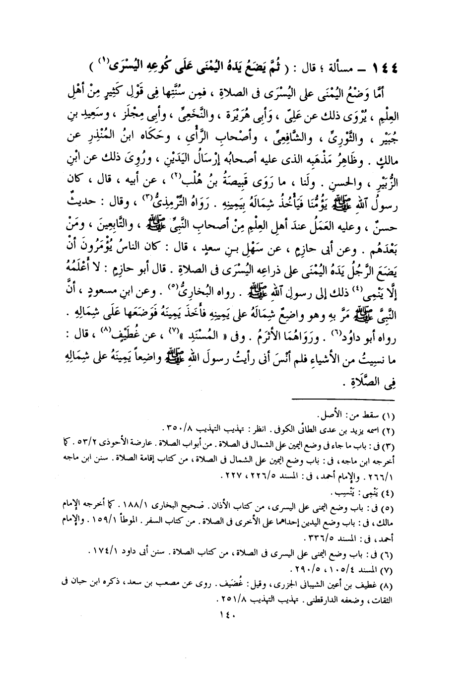 أمَّا وَضْعُ اليُمْنَى على اليُسْرَى في الصلاةِ، فمِن سُنَّتِها في قَوْلِ كَثِيرٍ مِنْ أهْلِ العِلْمِ، يُرْوَى ذلك عن عَلِىّ، وَأبِى هُرَيْرَة، والنَّخَعِىِّ، وأبِى مِجْلَز، وسَعِيدِ بنِ جُبَيْر، والثَّوْرِىِّ، والشَّافِعِىِّ، وأصْحابِ الرَّأْىِ، وحَكَاه ابنُ المُنْذِرِ عن مالكٍ. وظَاهِرُ مَذْهَبِه الذي عليه أصحابُه إرْسَالُ اليَدَيْنِ، ورُوِىَ ذلك عن ابْنِ الزُّبَيْرِ، والحسنِ. ولَنا، ما رَوَى قَبِيصَةُ بنُ هُلْب (٢)، عن أبيه، قال، كان رسولُ اللهِ -صلى اللَّه عليه وسلم- يَؤُمُّنَا فَيَأْخُذُ شِمَالَهُ بِيَمِينِهِ. رَوَاهُ التِّرمِذِىُّ (٣)، وقال: حديثٌ حسنٌ، وعليه العمَلُ عندَ أهلِ العِلْمِ مِنْ أصحابِ النَّبِيِّ -صلى اللَّه عليه وسلم-، والتَّابِعِينَ، ومَنْ بَعْدَهُم. وعن أبي حازِمٍ، عن سَهْلِ بنِ سعدٍ، قال: كان الناسُ يُؤْمَرُونَ أنْ يَضَعَ الرَّجُلُ يَدَهُ اليُمْنَى على ذراعِه اليُسْرَى في الصلاةِ. قال أبو حازِمٍ: لا أَعْلَمُهُ إلَّا يَنْمِى (٤) ذلك إلى رسولِ اللهِ -صلى اللَّه عليه وسلم-. رواه البُخارِيُّ (٥). وعن ابنِ مسعودٍ، أنَّ النَّبِىَّ -صلى اللَّه عليه وسلم- مَرَّ بهِ وهو واضِعٌ شِمَالَهُ على يَمِينِهِ فأخَذَ يَمِينَهُ فَوَضَعَها عَلَى شِمَالِهِ. رواه أبو داوُد (٦). ورَوَاهُمَا الأثرَمُ. وفى "المُسْنَدِ" (٧)، عن غُطَيْفٍ (٨)، قال: ما نسِيتُ من الأشياءِ فلم أنْسَ أني رأيتُ رسولَ اللَّه -صلى اللَّه عليه وسلم- واضِعًا يَمِينَهُ على شِمَالِهِ فِي الصَّلَاةِ.