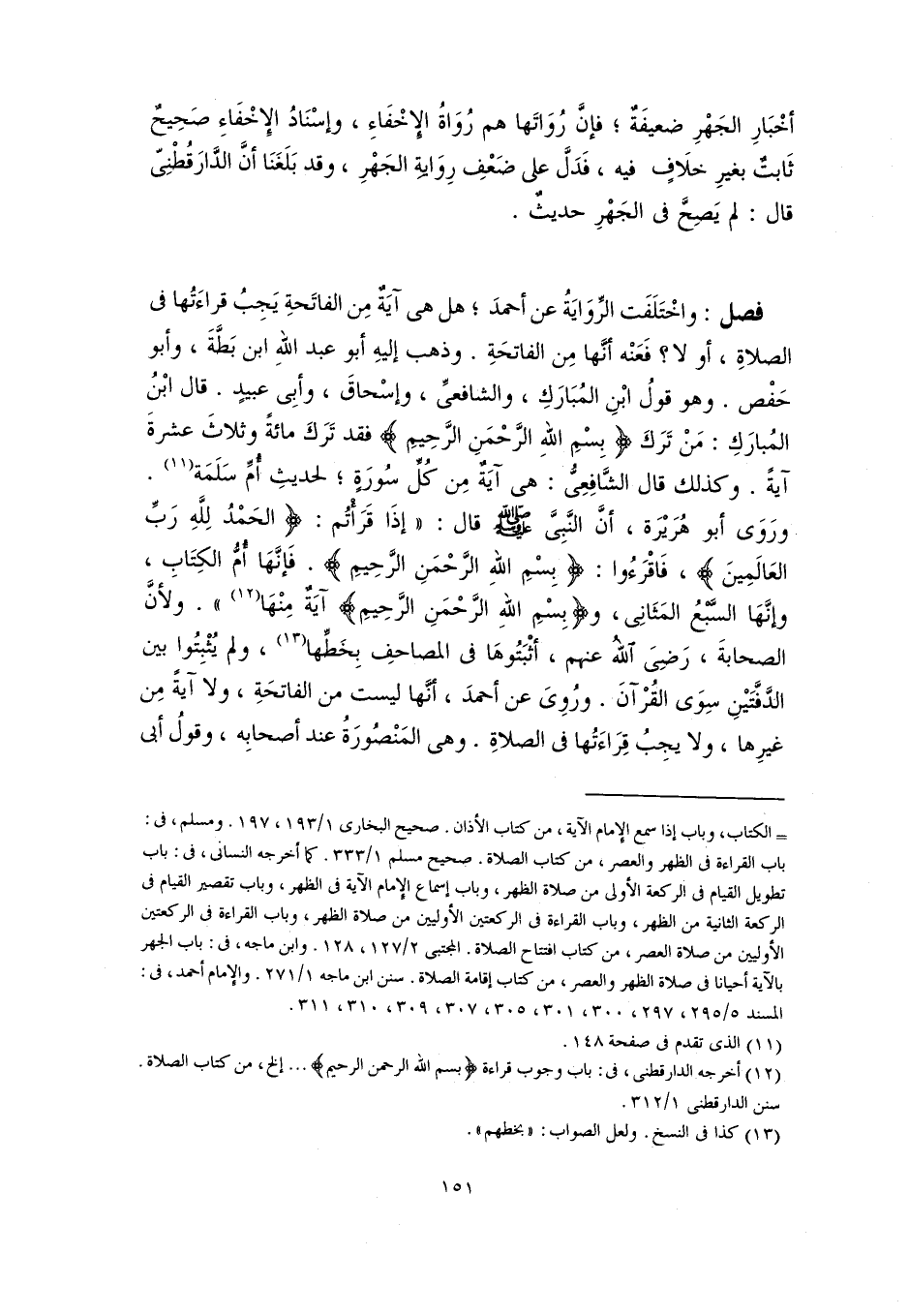 أخْبَارِ الجَهْرِ ضعيفَةٌ؛ فإنَّ رُوَاتَها هم رُوَاةُ الإِخْفَاءِ، وإسْنَادُ الإِخْفَاءِ صَحِيحٌ ثَابتٌ بغيرِ خلَافٍ فيه، فَدَلَّ على ضَعْفِ رِوَايةِ الجَهْرِ، وقد بَلَغَنَا أنَّ الدَّارَقُطْنِىّ قال: لم يَصِحَّ في الجَهْرِ حديثٌ.