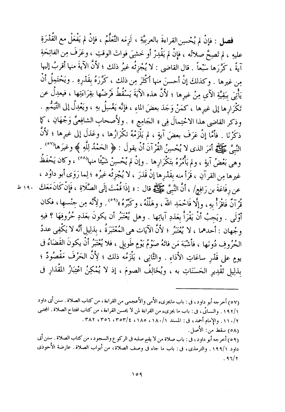 فصل: فإنْ لم يُحْسِن القراءةَ بالعربِيَّةِ، لَزِمَه التَّعَلُّمُ، فإنْ لم يَفْعَلْ مع القُدْرَةِ عليهِ، لم تَصِحَّ صلاتُه، فإِنْ لم يَقْدِرْ أو خَشِىَ فواتَ الوقتِ، وعَرَفَ مِن الفاتِحَةِ آيةً، كَرَّرَها سَبْعًا. قال القاضي: لا يُجْزِئُه غيرُ ذلك؛ لأنَّ الآيةَ منها أقربُ إليها مِن غيرها. وكذلكَ إنْ أحسنَ منها أكْثَرَ مِن ذلك، كَرَّرَهُ بِقَدْرِهِ. ويَحْتَمِلُ أنْ يَأْتِىَ بِبَقِيَّةِ الآىِ مِنْ غيرِها؛ لأنَّ هذه الآيَةَ يَسْقُطُ فَرْضُها بقِرَاءَتِها، فيعدِلُ عن تَكْرَارِها إلى غيرِها، كمَنْ وَجَدَ بعضَ الماءِ، فإنَّه يَغْسِلُ بهِ، ويَعْدِلُ إلى التَّيَمُّمِ. وذكر القاضي هذا الاحْتِمالَ في "الجَامِعِ". ولِأصحابِ الشافِعيِّ وَجْهَانِ، كما ذكَرْنَا. فأمَّا إنْ عَرَفَ بعضَ آيةٍ، لم يَلْزَمْهُ تكْرَارُها، وعَدَلَ إلى غيرِها، لأنَّ النَّبِىَّ -صلى اللَّه عليه وسلم- أمَرَ الذي لا يُحْسِنُ القُرْآنَ أنْ يقولَ: {الْحَمْدُ لِلَّهِ} وغيرَها (٥٧). وهى بَعْضُ آيةٍ، ولم يَأْمُرْهُ بتَكْرَارِها. وإنْ لم يُحْسِنْ شَيْئًا منها (٥٨)، وكان يَحْفَظُ غيرها مِن القرآنِ، قَرَأ منه بِقَدْرِها إنْ قَدَرَ، لا يُجْزِئُه غيرُه؛ لِما رَوَى أبو داوُد، عن رِفَاعَةَ بن رَافِعٍ، أنَّ النَّبِىَّ -صلى اللَّه عليه وسلم- قال: "إذَا قُمْتَ إلَى الصَّلَاةِ، فَإِنْ كَانَ مَعَكَ قُرْآنٌ فَاقْرَأْ بِهِ، وإلَّا فَاحْمَدِ اللهَ، وهَلِّلْهُ، وكَبِّرْهُ" (٥٩). ولِأنَّه مِن جِنْسِها، فكان أوْلَى. ويَجِبُ أنْ يَقْرَأَ بِعَدَدِ آياتِها. وهل يُعْتَبَرُ أن يكونَ بعَدَدِ حُرُوفِهَا؟ فيهِ وجْهان: أحدهما، لا يُعْتَبَرُ؛ لأنَّ الآيَات هي المُعْتَبَرَةُ، بِدَلِيلِ أنَّه لا يَكْفِى عددُ الحُرُوفِ دُونَها، فأشْبَهَ مَن فاتَهُ صَوْمُ يَوْمٍ طَوِيلٍ، فلا يُعْتَبَرُ أنْ يكونَ القَضَاءُ في يومٍ على قَدْرِ ساعَاتِ الأدَاءِ. والثَّانِى، يَلْزَمُه ذلك؛ لِأنَّ الحَرْفَ مَقْصُودٌ؛ بِدَلِيلِ تَقْدِيرِ الحَسَنَاتِ به، ويُخَالِفُ الصومَ، إذ لا يُمْكِنُ اعْتِبَارُ المقْدَارِ في
