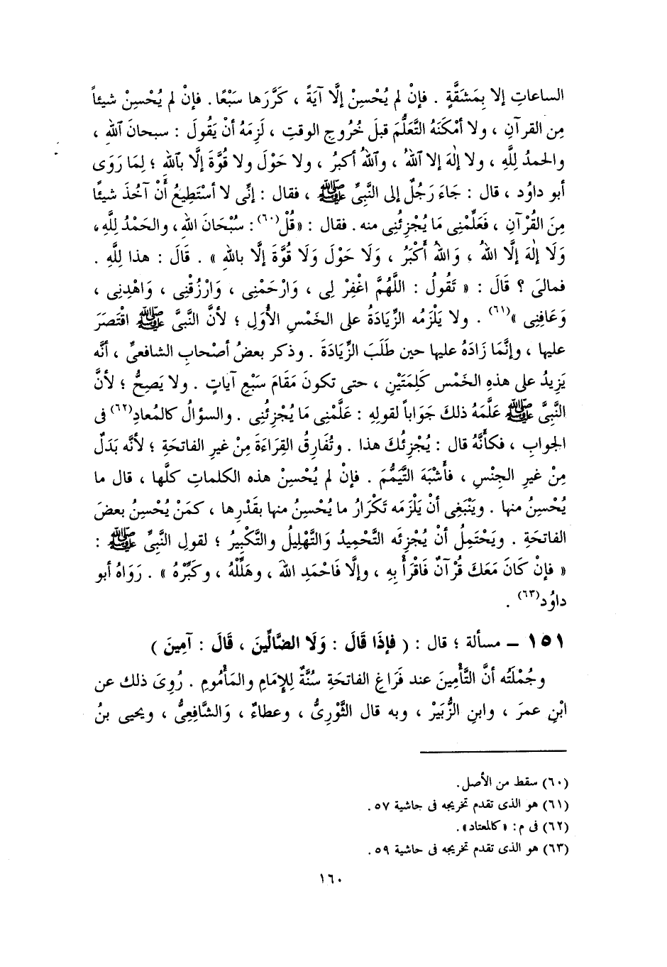 الساعاتِ إلا بِمَشَقَّةٍ. فإنْ لم يُحْسِنْ إلَّا آيَةً، كَرَّرَها سَبْعًا. فإنْ لم يُحْسِنْ شيئًا مِن القرآنِ، ولا أمْكَنَهُ التَّعَلُّمَ قبلَ خُرُوجِ الوقتِ، لَزِمَهُ أنْ يَقُولَ: سبحانَ اللهِ، والحمدُ لِلَّهِ، ولا إلهَ إلَّا اللهُ، واللهُ أكبرُ، ولا حَوْلَ ولا قُوَّةَ إلَّا باللهِ؛ لِمَا رَوَى أبو داوُد، قال: جَاءَ رَجُلٌ إلى النَّبِيِّ -صلى اللَّه عليه وسلم-، فقال: إنِّي لا أسْتَطِيعُ أَنْ آخُذَ شيئًا مِنَ القُرْآنِ، فَعَلِّمْنِى مَا يُجْزِئُنِى منه. فقال: "قُلْ (٦٠): سُبْحَانَ اللهِ، والحَمْدُ لِلَّهِ، وَلَا إلهَ إلَّا اللهُ، وَاللهُ أَكْبَرُ، وَلَا حَوْلَ وَلَا قُوَّةَ إلَّا باللهِ". قَالَ: هذا لِلَّهِ. فما لىَ؟ قَالَ: " تَقُولُ: اللَّهُمَّ اغْفِرْ لِى، وَارْحَمْنِى، وَارْزُقْنِى، وَاهْدِنِى، وَعَافِنِى" (٦١). ولا يَلْزَمُه الزِّيَادَةُ على الخَمْسِ الأُوَلِ؛ لأنَّ النَّبىَّ -صلى اللَّه عليه وسلم- اقْتَصَرَ عليها، وإنَّمَا زَادَهُ عليها حين طَلَبَ الزِّيَادَةَ. وذكر بعضُ أصْحابِ الشافعيِّ، أنَّه يَزِيدُ على هذهِ الخَمْس كَلِمَتَيْنِ، حتى تكونَ مَقَامَ سَبْعِ آياتٍ. ولا يَصِحُّ؛ لأنَّ النَّبِىَّ -صلى اللَّه عليه وسلم- عَلَّمَهُ ذلكَ جَوَابًا لقولِهِ: عَلَّمْنِى مَا يُجْزِئُنِى. والسؤالُ كالمُعادِ (٦٢) في الجوابِ، فكأنَّهُ قال: يُجْزِئُكَ هذا. وتُفَارِقُ القِرَاءَةَ مِنْ غيرِ الفاتحَةِ؛ لأنَّه بَدَلٌ مِنْ غيرِ الجِنْسِ، فأَشْبَهَ التَّيَمُّمَ. فإنْ لم يُحْسِنْ هذه الكلماتِ كلَّها، قال ما يُحْسِنُ منها. ويَنْبَغِى أنْ يَلْزَمَه تَكْرَارُ ما يُحْسِنُ منها بقَدْرِها، كمَنْ يُحْسِن بعضَ الفاتحَةِ. ويَحْتَمِلُ أنْ يُجْزِئَه التَّحْمِيدُ وَالتَّهْلِيلُ والتَّكْبِيرُ؛ لقولِ النَّبِيِّ -صلى اللَّه عليه وسلم-: "فإنْ كَانَ مَعَكَ قُرْآنٌ فَاقْرَأْ بِهِ، وإلَّا فَاحْمَدِ اللهَ، وهَلِّلْهُ، وكَبِّرْهُ". رَوَاهُ أبو داوُد (٦٣).