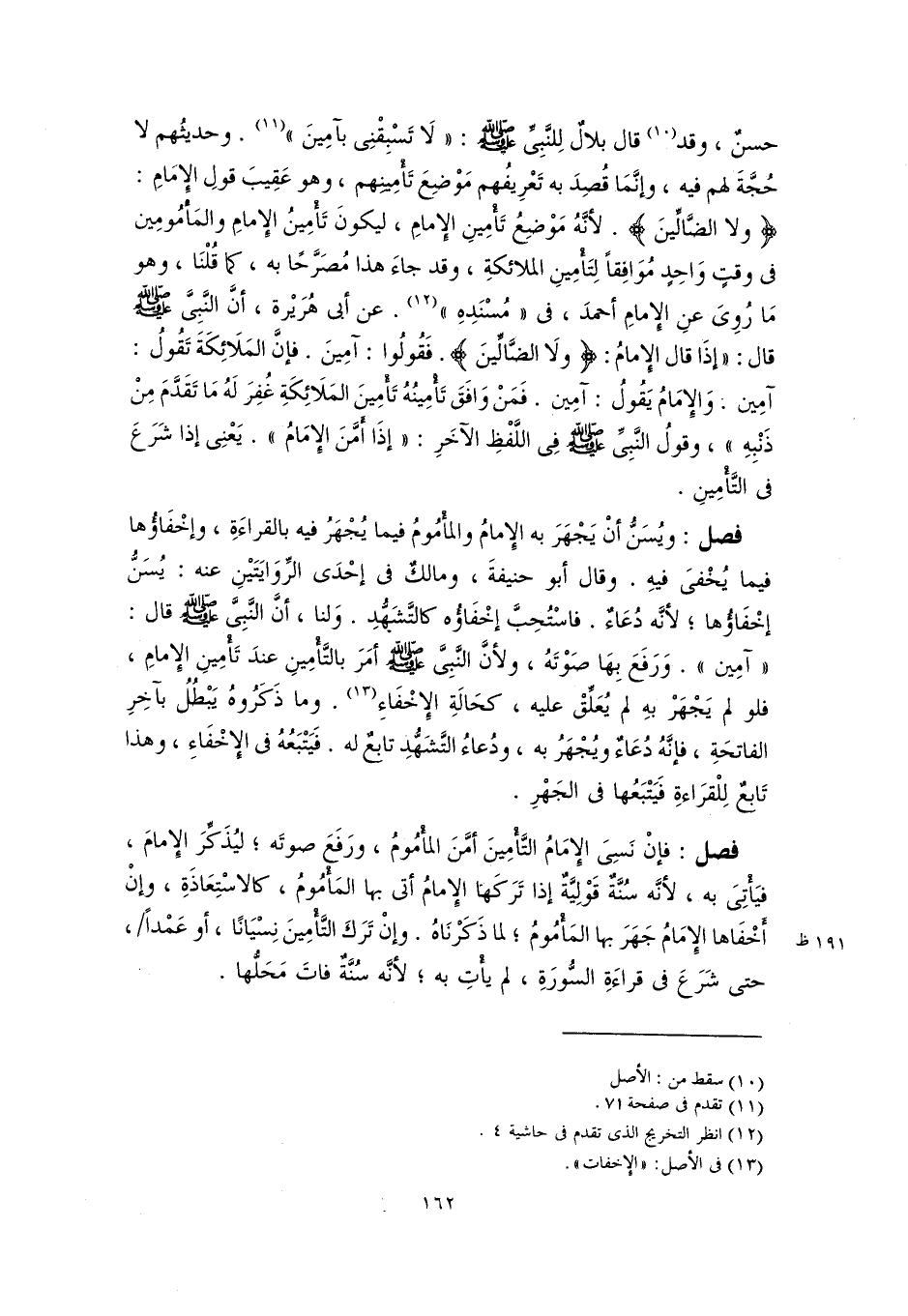 فصل: ويُسَنُّ أنْ يَجْهَرَ به الإِمامُ والمأْمُومُ فيما يُجْهَرُ فيه بالقراءَةِ، وإخْفَاؤُها فيما يُخْفَى فيهِ. وقال أبو حنيفةَ، ومالكٌ في إحْدَى الرِّوَايَتَيْنِ عنه: يُسَنُّ إخْفَاؤُها؛ لأنَّه دُعَاءٌ. فاسْتُحِبَّ إخْفَاؤُه كالتَّشَهُّدِ. وَلنا، أنَّ النَّبِيَّ -صلى اللَّه عليه وسلم- قال: "آمِين". وَرَفَعَ بِهَا صَوْتَهُ، ولأنَّ النَّبِيِّ -صلى اللَّه عليه وسلم- أمَرَ بالتَّأْمِينِ عندَ تَأْمِينِ الإِمامِ، فلو لم يَجْهَرْ بهِ لم يُعَلِّقْ عليه، كحَالَةِ الإِخْفَاءِ (١٣). وما ذَكَرُوهُ يَبْطُلُ بآخِرِ الفاتحَةِ، فإنَّهُ دُعَاءٌ ويُجْهَرُ به، ودُعاءُ التَّشَهُّدِ تابِعٌ له. فَيَتْبَعُهُ في الإِخْفَاءِ، وهذا تَابِعٌ لِلْقرَاءةِ فَيَتْبَعُها في الجَهْرِ.
