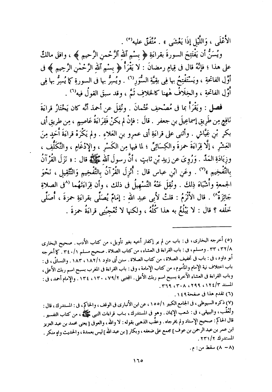 فصل: ويَقْرَأُ بما في مُصْحفِ عُثْمانَ. ونُقِلَ عن أحمدَ أنَّه كان يَخْتَارُ قراءَةَ نَافِعٍ مِن طَرِيقِ إسماعِيلَ بنِ جعفر. قالَ: فإنْ لم يكنْ فَقِرَاءَةُ عَاصِمٍ، مِن طريقِ أبي بكرِ بْنِ عَيَّاشٍ. وأثنى على قراءَةِ أبي عمرِو بنِ العَلاءِ. ولم يَكْرَهْ قراءَةَ أَحَدٍ مِنَ العَشْرِ، إلَّا قِرَاءَةَ حمزةَ والكِسَائِىِّ؛ لما فيها مِن الكَسْرِ، والإِدْغَامِ، والتَّكَلُّفِ، وزِيَادَةِ المَدِّ. وَرُوِىَ عن زيدِ بْنِ ثابتٍ، أنَّ رسولَ اللهِ -صلى اللَّه عليه وسلم- قال: "نَزَلَ القُرْآنُ بِالتَّفْخِيمِ" (٧). وعَنِ ابْنِ عباس قال: أُنْزِلَ القُرْآنُ يالتَّفْخِيمِ وَالتَّثْقِيلِ، نَحْوَ الجمعةِ وأَشْبَاهَ ذِلكَ. ونُقِلَ عَنْهُ التَّسْهِيلُ في ذلك، وأن قِرَاءَتَهُما [في الصلاةِ جَائِزَةٌ] (٨). قال الأثْرَمُ: قلتُ لأبِى عبدِ اللهِ: إمَامٌ يُصَلِّى بقراءَةِ حمزةَ، أُصَلِّى خَلْفه؟ قال: لا يَبْلُغُ به هذا كُلَّهُ، ولكنها لا تُعْجِبُنِى قراءَةُ حمزةَ.