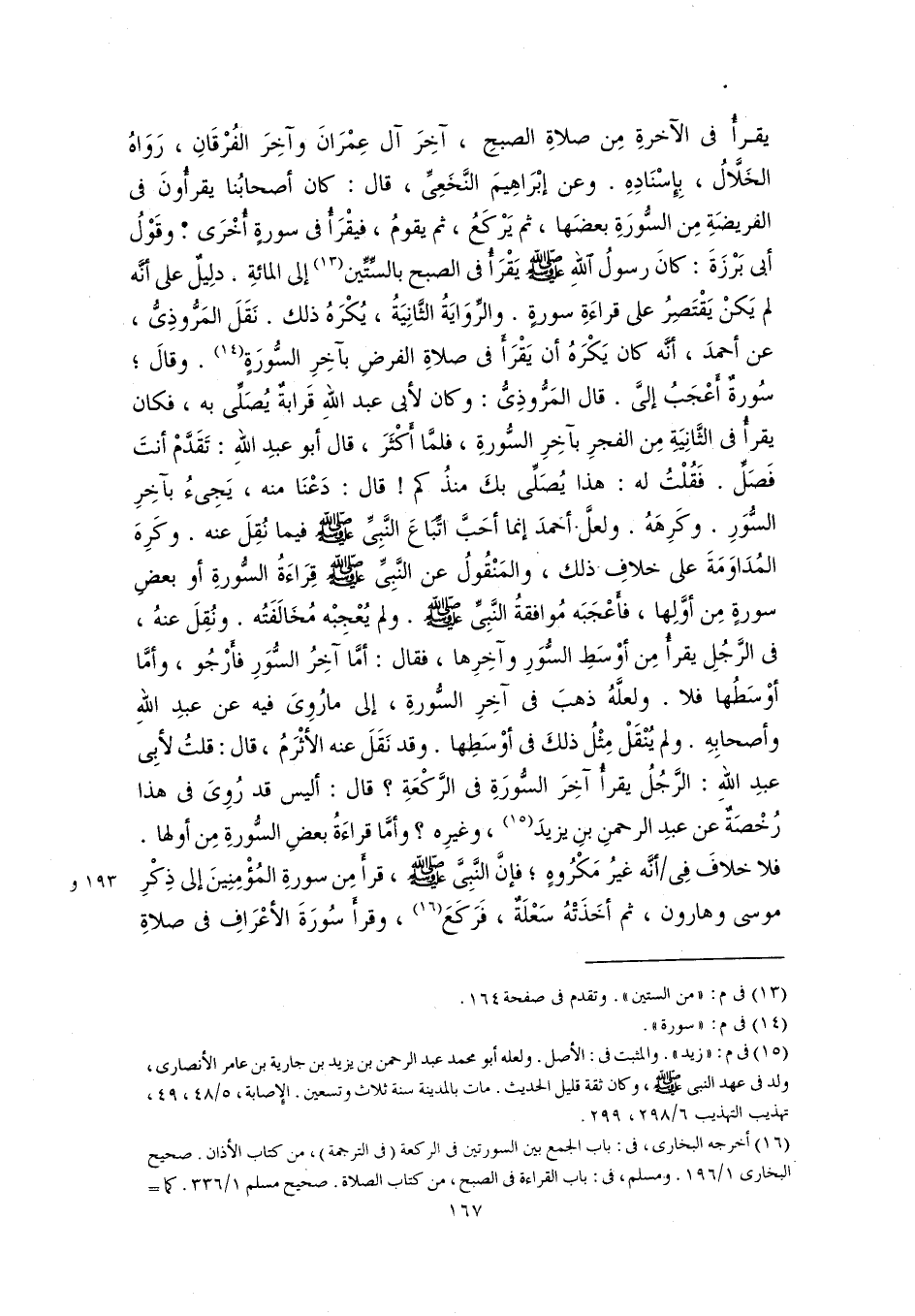 يقرأُ فى الآخرةِ مِن صلاةِ الصبحِ، آخِرَ آل عِمْرَانَ وآخِرَ الفُرْقَانِ، رَوَاهُ الخَلَّالُ، بِإِسْنَادِهِ. وعن إبْرَاهِيمَ النَّخَعِىِّ، قال: كان أصحابُنا يقرأُونَ في الفريضَةِ مِن السُّورَةِ بعضَها، ثم يَرْكَعُ، ثم يقومُ، فيقْرَأُ في سورةٍ أُخْرَى. وقَوْلُ أبى بَرْزَةَ: كانَ رسولُ اللهِ -صلى اللَّه عليه وسلم- يَقْرَأُ في الصبح بالسِّتِّين (١٣) إلى المائةِ. دلِيلٌ على أنَّه لم يَكنْ يَقْتَصِرُ على قراءَةِ سورةٍ. والرِّوَايَةُ الثَّانِيَةُ، يُكْرَهُ ذلك. نَقَلَ المَرُّوذِيُّ، عن أحمدَ، أنَّه كان يَكْرَهُ أن يَقْرَأَ في صلاةِ الفرضِ بآخِرِ السُّورَةِ (١٤). وقالَ؛ سُورةٌ أُعجَبُ إلىَّ. قال المَرُّوذِيُّ: وكان لأبي عبد اللهِ قَرابةٌ يُصَلِّى به، فكان يقرأُ في الثَّانِيَةِ مِن الفجرِ بآخِرِ السُّورةِ، فلمَّا أَكْثَرَ، قال أبو عبدِ اللهِ: تَقَدَّمْ أنتَ فَصَلِّ. فَقُلْتُ له: هذا يُصَلِّى بكَ منذُ كم! قال: دَعْنَا منه، يَجِىءُ بآخِرِ السُّوَرِ. وكَرِهَهُ. ولعلَّ أحمدَ إنما أحَبَّ اتِّباعَ النَّبِيِّ -صلى اللَّه عليه وسلم- فيما نُقِلَ عنه. وكَرِهَ المُدَاوَمَةَ على خلافِ ذلك، والمَنْقُولُ عن النَّبِيِّ -صلى اللَّه عليه وسلم- قِرَاءَةُ السُّورةِ أو بعضِ سورةٍ مِن أوَّلِها، فأَعْجَبَه مُوافقةُ النَّبِيِّ -صلى اللَّه عليه وسلم-. ولم يُعْجِبْه مُخَالَفَتُه. ونُقِلَ عنهُ، في الرَّجُلِ يقرأُ مِن أوْسَطِ السُّوَرِ وآخِرِها، فقال: أمَّا آخِرُ السُّوَرِ فأَرجُو، وأمَّا أوْسَطُها فلا. ولعلَّهُ ذهبَ في آخِرِ السُّورةِ، إلى ما رُوِىَ فيه عن عبدِ اللهِ وأصحابِهِ. ولم يُنْقَلْ مِثْلُ ذلكَ في أوْسَطِها. وقد نَقَلَ عنه الأثْرَمُ، قال: قلتُ لأبِى عبدِ اللهِ: الرَّجُلُ يقرأُ آخِرَ السُّورَةِ في الرَّكْعَةِ؟ قال: أليس قد رُوِىَ في هذا رُخْصَةٌ عن عبدِ الرحمنِ بنِ يزيدَ (١٥)، وغيرِه؟ وأمَّا قراءَةُ بعضِ السُّورةِ مِن أولها. فلا خلافَ فِي أنَّه غيرُ مَكْرُوهٍ؛ فإنَّ النَّبِيَّ -صلى اللَّه عليه وسلم-، قرأَ مِن سورةِ المُؤْمِنِينَ إلى ذِكْرِ موسى وهارون، ثم أخَذَتْهُ سَعْلَةٌ، فَرَكَعَ (١٦)، وقرأَ سُورَةَ الأعْرَافِ في صلاةِ
