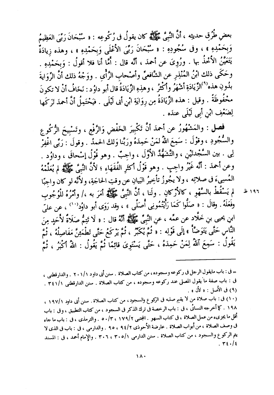 بعضِ طُرُقِ حديثِه، أنَّ النَّبِىَّ -صلى اللَّه عليه وسلم- كان يقولُ في رُكُوعِه: "سُبْحَانَ رَبِّىَ العَظِيمُ وَبِحَمْدِهِ"، وفى سُجُودِهِ: "سُبْحَانَ رَبِّىَ الأعْلَى وَبِحَمْدِهِ"، وهذه زِيادَةٌ يَتَعَيَّنُ الأخْذُ بها. ورُوِىَ عن أحمدَ، أنَّه قال: أَمَّا أنا فلا أقولُ: وَبحَمْدِهِ. وحَكَى ذلك ابْنُ المُنْذِرِ عن الشَّافعىِّ وأصْحابِ الرَّأْىِ. ووَجْهُ ذلك أنَّ الرِّوَايةَ بدُونِ هذه (٩) الزِّيَادَةِ أشْهَرُ وأكْثرُ، وهذِهِ الزِّيَادَةُ قال أبو داوُد: نَخَافُ أنْ لا تكونَ محْفُوظَةً. وقيل: هذه الزِّيَادَةُ مِن رِوَايَةِ ابْنِ أبى لَيْلَى. فيَحْتَمِلُ أنَّ أحمدَ تَرَكَها لِضَعْفِ ابْنِ أبِى لَيْلَى عندَه.