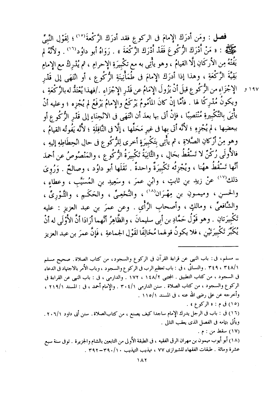 فصل: ومَن أدرَكَ الإِمامَ في الركوعِ فقد أدرَكَ الرَّكْعةَ (١٥)؛ لِقَوْلِ النَّبِيِّ -صلى اللَّه عليه وسلم-: "مَنْ أَدْرَكَ الرُّكُوعَ فَقَدْ أَدْرَكَ الرَّكْعَةَ". رَوَاهُ أبو داوُد (١٦). ولأنَّهُ لم يَفُتْهُ مِن الأركَانِ إلَّا القيامُ، وهو يأْتِى به مع تكْبِيرَةِ الإِحرامِ، ثم يُدْرِكُ مع الإِمامِ بَقِيَّةَ الرَّكْعَةِ، وهذا إذا أدرَكَ الإِمامَ في طُمَأْنِينَةِ الرُّكُوعِ، أو انْتَهَى إلى قَدْرِ الإِجْزَاءِ من الرُّكُوعِ قبلَ أنْ يَزُولَ الإِمَامُ عن قَدْرِ الإِجْزَاءِ. فهذا يُعْتَدُّ له بالرَّكْعَةِ، ويكونُ مُدْرِكًا لها. فأمَّا إنْ كانَ المأمُومُ يَرْكَعُ والإِمامُ يَرْفَعُ لم يُجْزِه؛ وعليه أنْ يأْتِىَ بِالتَّكْبِيرةِ مُنْتَصِبًا، فإنْ أتى بها بعدَ أن انْتَهَى في الانْحِنَاءِ إلى قَدْرِ الرُّكُوعِ أو ببعضِها، لم يُجْزِهِ؛ لأنَّه أتى بها في غيرِ مَحَلِّها، إلَّا في النَّافِلَةِ؛ لأَنَّه يَفُوتُه القيامُ، وهو مِنْ أرْكانِ الصَّلاةِ، ثم يَأْتِى بِتَكْبِيرَةٍ أخرى لِلرُّكُوعِ في حالِ انْحِطَاطِهِ إليهِ، فالأُولَى رُكْنٌ لا تَسْقُطُ بحَالٍ، والثَّانِيَةُ تَكْبِيرَةُ الرُّكُوعِ، والمَنْصُوصُ عن أحمدَ أنَّها تَسْقُطُ ههُنا، ويُجْزِئُه تَكْبِيرَةٌ واحدةٌ. نَقَلَها أبو داوُد، وصالحٌ. وَرُوِىَ ذلك (١٧) عنْ زيدِ بنِ ثابتٍ، وابْنِ عمرَ، وسَعِيدِ بنِ المُسَيَّبِ، وعطاءٍ، والحسنِ، وميمونِ بنِ مِهْرَان (١٨)، والنَّخَعِىِّ، والحَكَمِ، والثَّوْرِىِّ، والشَّافعىِّ، ومالكٍ، وأصحابِ الرَّأْىِ. وعن عمرَ بنِ عبد العزيزِ: عليه تَكْبِيرَتانِ. وهو قَوْلُ حَمَّادِ بن أبِى سليمانَ، والظَّاهِرُ أنَّهما أرَادَا أنَّ الأَوْلَى له أنْ يُكَبِّرَ تَكْبِيرَتَيْنِ، فلا يكونُ قولهما مُخَالِفًا لقَوْلِ الجماعةِ، فَإنَّ عمرَ بن عبد العزيز