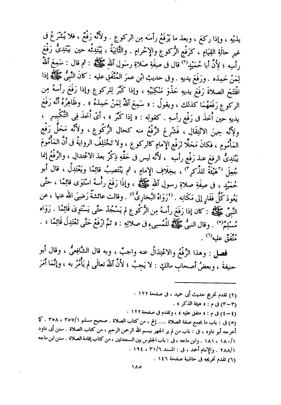 يدَيْهِ، وإذا ركعَ، وبعدَ ما يَرْفَعُ رأسَه مِن الركوعِ. ولأنَّه رَفْعٌ، فلا يُشْرَعُ في غيرِ حالَةِ القِيَامِ، كرَفْعِ الرُّكوعِ والإِحْرامِ. والثَّانِيَةُ، يَبْتَدِئُه حين يَبْتَدِئُ رَفْعَ رأسِه؛ لِأنَّ أبا حُمَيْدٍ (٢) قال في صِفَةِ صَلاةِ رسولِ اللهِ - صلى اللهِ عليه وسلم -: ثم قال: سَمِعَ اللهُ لِمَنْ حَمِدَه. ورَفَعَ يديهِ. وفي حديثِ ابْنِ عمرَ المُتَّفَقِ عليه: كانَ النَّبِىُّ -صلى اللَّه عليه وسلم- إذا افْتَتَحَ الصلاةَ رَفَعَ يديهِ حَذْوَ مَنْكِبَيْهِ، وإذا كَبَّرَ لِلركوعِ وإذا رَفَعَ رأسهُ مِن الركرعِ رَفَعَهُمَا كذلك، ويقولُ: "سَمِعَ اللهُ لِمَنْ حَمِدَهُ". وظَاهِرُهُ أنَّه رَفَعَ يديهِ حين أَخَذَ في رَفْعِ رأسهِ. كقولِه: "إذا كَبَّرَ"، أىْ أَخَذَ فِي التَّكْبِيرِ، ولِأنَّه حِينَ الانْتِقَالِ، فَشُرِعَ الرَّفْعُ منه كحالِ الرُّكُوعِ، ولأنَّه مَحَلُّ رَفْعِ المَأْمُومِ، فكانَ مَحَلًّا لرَفْعِ الإِمامِ كالركوعِ، ولا تَخْتَلِفُ الروايةُ في أنَّ المَأْمُومَ يَبْتَدِئُ الرفع عندَ رَفْعِ رأسِه، لأنَّه ليس في حَقِّهِ ذِكْرٌ بعدَ الاعْتدالِ، والرَّفْعُ إنما جُعِلَ [هَيْئَةً للذِّكرِ] (٣)، بخِلَافِ الإمامِ، ثم يَنْتَصِبُ قائِمًا ويَعْتَدِلُ، قال أبو حُمَيْدٍ، في صِفَةِ صلاةِ رسولِ اللهِ -صلى اللَّه عليه وسلم-، وإذَا رَفَعَ رأْسهُ اسْتَوَى قائِمًا، حتَّى يَعُودَ كُلُّ فَقَارٍ إلى مَكَانِه. [رَوَاهُ البُخارِىُّ] (٤). وقالت عائشةُ رَضِىَ اللَّه عنها، عن النَّبِيِّ -صلى اللَّه عليه وسلم-: كان إذا رَفَعَ رأسهُ مِن الرُّكُوعِ لم يَسْجُدْ حتَّى يَسْتَوِىَ قَائِمًا. رَوَاه مُسْلِمٌ (٥). وقال النبيُّ -صلى اللَّه عليه وسلم- للْمُسِىءِ في صلاتِهِ: "ثمَّ ارْفَعْ حَتَّى تَعْتَدِلَ قَائِمًا". مُتَّفَقٌ عليه (٦).