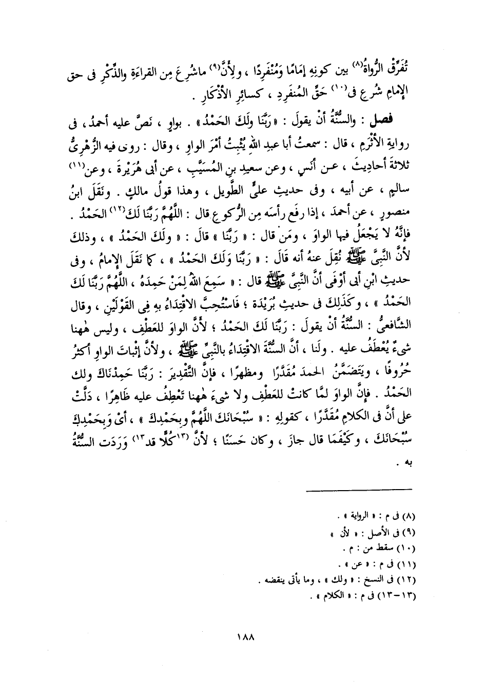 فصل: والسُّنَّةُ أنْ يقولَ: "رَبَّنَا ولَكَ الحَمْدُ". بواوٍ، نَصَّ عليه أحمدُ، في روايةِ الأثْرَمِ، قال: سمعتُ أبا عبدِ اللهِ يُثْبِتُ أمْرَ الواوِ، وقال: روى فيه الزُّهْرِىُّ ثلاثةَ أحادِيثَ، عن أنَسٍ، وعن سعيدِ بنِ المُسَيَّبِ، عن أبي هُرَيْرةَ، وعن (١١) سالمٍ، عن أبيه، وفي حديثِ عليٍّ الطَّويل، وهذا قولُ مالكٍ. ونَقَلَ ابنُ منصورٍ، عن أحمدَ، إذا رفَع رأسَه مِن الرُّكوعِ قال: اللَّهُمَّ رَبَّنَا لَكَ (١٢) الحَمْدُ. فإنَّهُ لا يَجْعَلُ فيها الواوَ، ومَن قال: "رَبَّنَا" قالَ: "ولَكَ الحَمْدُ"، وذلكَ لأنَّ النَّبِىَّ -صلى اللَّه عليه وسلم- نُقِلَ عنهُ أنه قَالَ: "رَبَّنَا وَلَكَ الحَمْدُ", كما نَقَلَ الإِمامُ، وفى حديثِ ابْنِ أبى أوْفَى أنَّ النَّبِىَّ -صلى اللَّه عليه وسلم- قال: "سَمِعَ اللهُ لِمَنْ حَمِدَهُ، اللَّهُمَّ رَبَّنَا لَكَ الحَمْدُ"، وكَذَلِكَ في حديثِ بُرَيْدَة؛ فَاسْتُحِبَّ الاقْتِدَاءُ بهِ في القَوْلَيْنِ، وقال الشَّافعىُّ: السُّنَّةُ أنْ يقولَ: رَبَّنَا لَكَ الحَمْدُ؛ لأَنَّ الواوَ للعَطْفِ، وليس ههنا شيءٌ يُعْطَفُ عليه. ولَنا، أنَّ السُّنَّةَ الاقْتِدَاءُ بالنَّبِىِّ -صلى اللَّه عليه وسلم-، ولأنَّ إثْباتَ الواوِ أكثرُ حُرُوفًا، ويَتَضَمَّن الحمدَ مُقَدَّرًا ومظهرًا، فإنَّ التَّقْدِيرَ: رَبَّنَا حَمِدْنَاكَ ولك الحَمْدُ. فإنَّ الواوَ لمَّا كانتْ للعَطْفِ ولا شىءَ ههنا تَعْطِفُ عليه ظَاهِرًا، دَلَّتْ على أنَّ في الكلامِ مُقَدَّرًا، كقولِهِ: "سُبْحَانَكَ اللَّهُمَّ وبِحَمْدِكَ"، أىْ وَبِحَمْدِكَ سُبْحَانَكَ، وكَيْفَمَا قال جازَ، وكان حَسَنًا؛ لأنَّ [كُلًّا قد] (١٣) وَرَدَت السُّنَّةُ به.