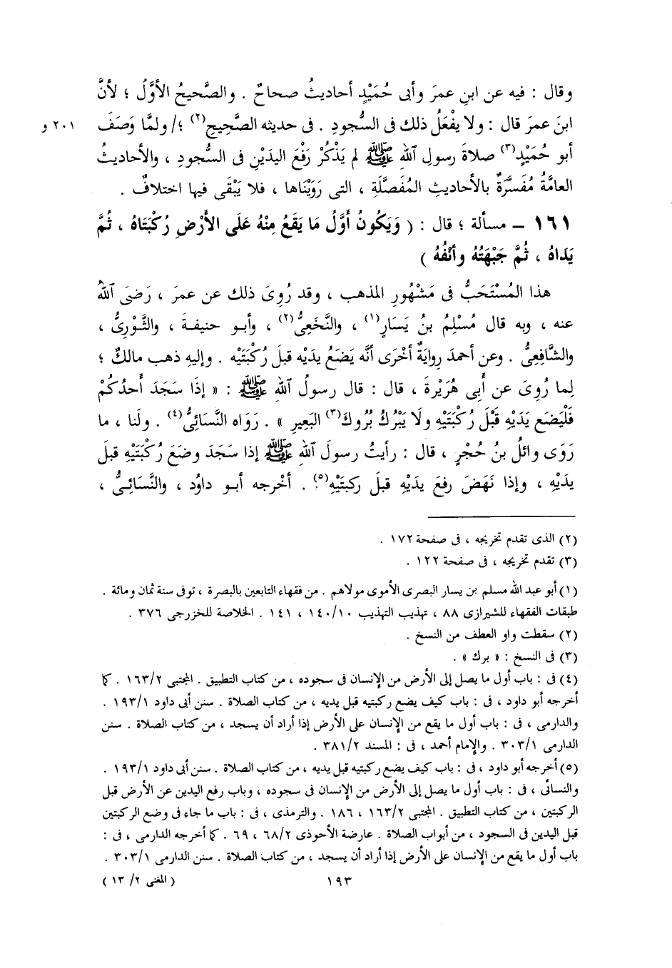 (٤) في: باب أول ما يصل إلى الأرض من الإِنسان في سجوده، من كتاب التطبيق. المجتبى ٢/ ١٦٣. كما أخرجه أبو داود، في: باب كيف يضع ركبتيه قبل يديه، من كتاب الصلاة. سنن أبي داود ١/ ١٩٣. والدارمى، في: باب أول ما يقع من الإِنسان على الأرض إذا أراد أن يسجد، من كتاب الصلاة. سنن الدارمي ١/ ٣٠٣. والإِمام أحمد، في: المسند ٢/ ٣٨١.