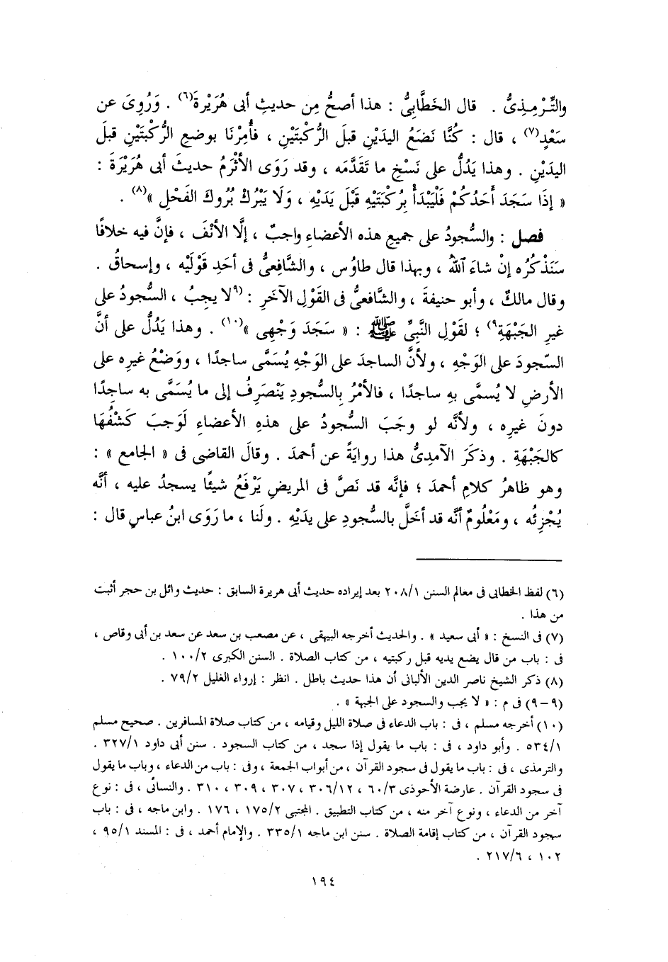 والتِّرْمِذِىُّ. قال الخَطَّابِىُّ: هذا أصحُّ مِن حديثِ أبى هُرَيْرةَ (٦). وَرُوِىَ عن سَعْدٍ (٧)، قال: كُنَّا نَضَعُ اليدَيْنِ قبلَ الركْبتَيْنِ، فأُمِرْنَا بوضعِ الرُّكْبتَيْنِ قبلَ اليدَيْنِ. وهذا يَدُلُّ على نَسْخِ ما تَقَدَّمَه، وقد رَوَى الأثْرَمُ حديثَ أبى هُرَيْرَةَ: "إذَا سَجَدَ أَحَدُكُمْ فَلْيَبْدَأْ بِرُكْبَتَيْهِ قَبْلَ يَدَيْهِ، وَلَا يَبْرُكْ بُرُوكَ الفَحْلِ" (٨).