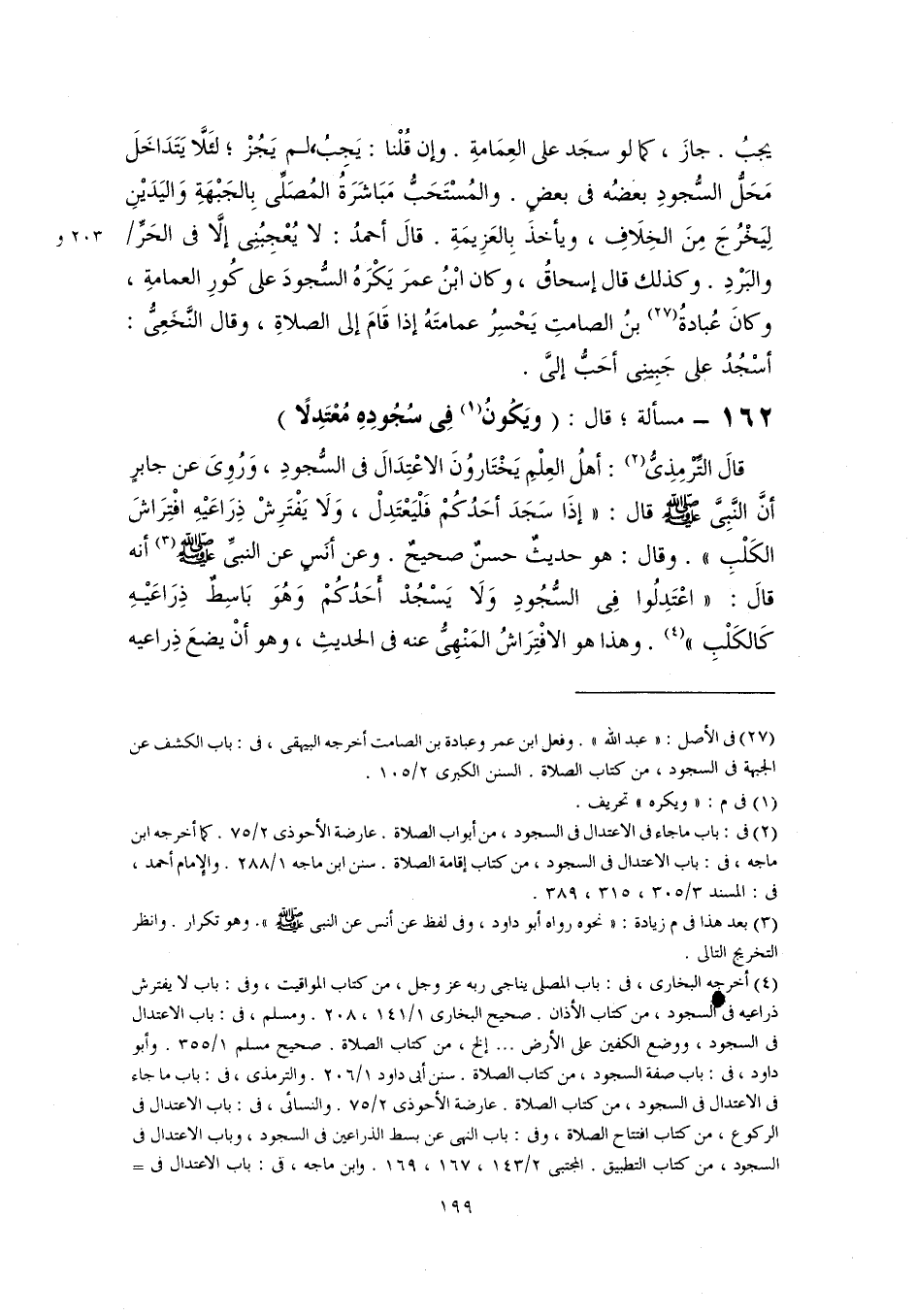 قالَ التِّرمِذِىُّ (٢): أهلُ العِلْمِ يَخْتَارُونَ الاعْتِدَالَ في السُّجودِ، وَرُوِىَ عن جابرٍ أنَّ النَّبِىَّ -صلى اللَّه عليه وسلم- قال: "إذَا سَجَدَ أحَدُكُمْ فَلْيَعْتَدِلْ، وَلَا يَفْتَرِشْ ذِرَاعَيْهِ افْتِرَاشَ الكَلْبِ". وقال: هو حديثٌ حسنٌ صحيحٌ. وعن أنَسٍ عن النبيِّ -صلى اللَّه عليه وسلم- (٣) أنه قالَ: "اعْتَدِلُوا في السُّجُودِ وَلَا يَسْجُدْ أَحَدُكُمْ وَهُوَ بَاسِطٌ ذِرَاعَيْهِ كَالكَلْبِ" (٤). وهذا هو الافْتِرَاشُ المَنْهِىُّ عنه في الحديثِ، وهو أنْ يضعَ ذِراعيه