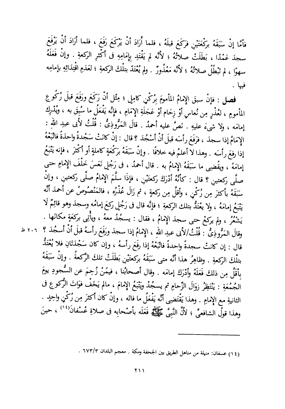 فصل: فإنْ سبقَ الإِمامُ المأمومَ بِرُكْنٍ كامِلٍ؛ مِثْل أنْ رَكَعَ ورَفَعَ قبلَ رُكُوعِ المأمومِ، لعُذْرٍ مِن نُعاسٍ أَوْ زِحَام أوْ عَجَلَةِ الإِمَامِ، فإِنَّه يَفْعَلُ ما سُبِقَ به، ويُدْرِك إمامَه، ولا شىءَ عليهِ. نَصَّ عليه أحمدُ. قالَ المَرُّوذِيُّ: قُلْتُ لأَبى عبدِ اللهِ: الإِمَامُ إذا سجدَ، فرَفَعَ رأسَه قبلَ أنْ أسْجُدَ؟ قال: إنْ كانَتْ سَجْدةً واحدَةً فاتْبَعْهُ إذا رفعَ رأسَه. وهذا لا أعلمُ فيه خلافًا. وإنْ سَبَقَهُ برَكْعَةٍ كاملةٍ أو أَكْثَرَ، فإنَّه يَتْبَعُ إمامَهُ، ويقْضِى ما سَبَقَهُ الإِمامُ به. قال أحمدُ، في رَجُلٍ نَعَسَ خَلْفَ الإِمامِ حتى صلَّى ركعتينِ؟ قال: كأنَّهُ أدْرَكَ رَكْعتَيْنِ، فإذَا سلَّمَ الإِمامُ صلَّى ركعتينِ، وإنْ سَبَقَهُ بأكثرَ مِن رُكْنٍ، وأقلَّ مِن ركعةٍ، ثم زَالَ عُذْرُه، فالمَنْصُوصُ عن أحمدَ أنَّه يَتْبَعُ إمامَهُ، ولا يعْتَدُّ بتلك الركعةِ؛ فإنَّه قال في رَجُلٍ ركعَ إمامُه وسجدَ وهو قائِمٌ لَا يَشْعُرُ، ولم يركعْ حتى سجدَ الإِمامُ، فقال: يسجُدُ معهُ، ويأْتِى بركعَةٍ مكانَها. وقالَ المَرُّوذِىُّ: قُلْتُ لأبي عبدِ اللهِ، الإِمامُ إذا سجدَ ورَفَعَ رأسهُ قبلَ أنْ أسجُدَ؟ قال: إن كانتْ سجدةً واحدةً فاتْبَعْهُ إذا رفَعَ رأسهُ، وإن كان سَجْدَتَانِ فلا يُعْتَدُّ بتلْكَ الركعةِ. وظاهِرُ هذا أنَّه متى سَبَقَهُ بركعتَيْنِ بَطَلَتْ تلكَ الرَّكْعَةُ. وإنْ سَبَقَهُ بِأقَلَّ مِن ذلكَ فَعَلَهُ وأَدْرَكَ إمامَه. وقال أصحابُنا، فيمَنْ زُحِمَ عن السُّجودِ يومَ الجُمُعَةِ: يَنْتَظِرُ زوَالَ الزِّحامِ ثم يسجُدُ ويَتْبَعُ الإِمامَ، ما لم يَخَفْ فوَاتَ الرُّكُوعِ في الثانيةِ مع الإِمامِ. وهذا يَقْتَضِى أنَّه يَفْعَلُ ما فاتَه، وإنْ كان أكثرَ مِن رُكْنٍ واحِدٍ. وهذا قولُ الشافعىِّ؛ لأنَّ النَّبِىَّ -صلى اللَّه عليه وسلم- فَعَلَه بأصْحابِه في صلاةِ عُسْفانَ (١٤)، حينَ
