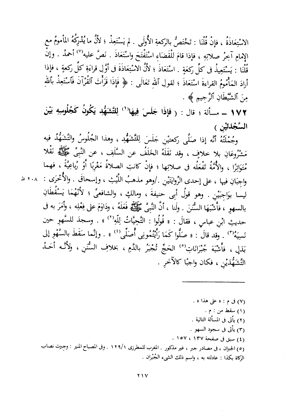١٧٢ - مسألة؛ قال: (فإذَا جَلَسَ فِيهَا (١) لِلتَّشَهُّدِ يَكُونُ كَجُلُوسِهِ بَيْنَ السَّجْدَتَيْنِ)