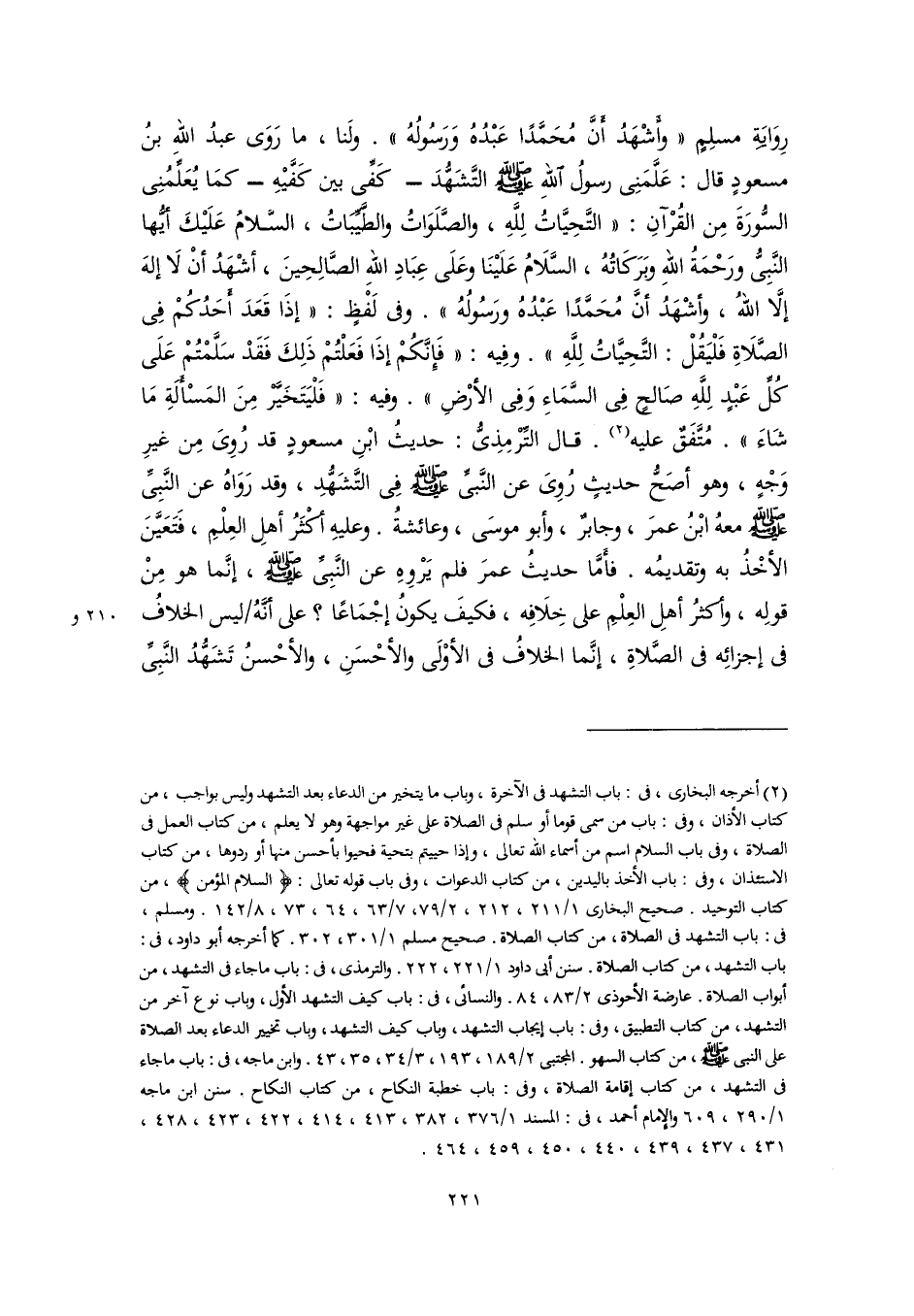 رِوَايَةِ مسلِمٍ "وأَشْهَدُ أَنَّ مُحَمَّدًا عَبْدُهُ وَرَسُولُهُ". ولَنا، ما رَوَى عبدُ اللهِ بنُ مسعودٍ قال: عَلَّمَنِى رسولُ اللهِ -صلى اللَّه عليه وسلم- التَّشَهُّدَ - كَفِّى بين كَفَّيْهِ - كمَا يُعَلِّمُنِى السُّورَةَ مِن القُرْآنِ: "التَّحِيَّاتُ لِلَّهِ، والصَّلَوَاتُ والطَّيِّبَاتُ، السَّلامُ عَلَيْكَ أيُّها النَّبِىُّ ورَحْمَةُ اللهِ وبَرَكَاتُهُ، السَّلَامُ عَلَيْنَا وعَلَى عِبَادِ اللهِ الصَّالِحِينَ، أشْهَدُ أنْ لَا إلهَ إلَّا اللهُ، وأشْهَدُ أنَّ مُحَمَّدًا عَبْدُهُ ورَسُولُهُ". وفى لَفْظٍ: "إذَا قَعَدَ أحَدُكُمْ في الصَّلَاةِ فَلْيَقُلْ: التَّحِيَّاتُ لِلَّهِ". وفِيه: "فَإِنَّكُمْ إذَا فَعَلْتُمْ ذَلِكَ فَقَدْ سَلَّمْتُمْ عَلَى كُلِّ عَبْدٍ لِلَّهِ صَالحٍ في السَّمَاءِ وَفِى الأرْضِ". وفيه: "فَلْيَتَخَيَّرْ مِنَ المَسْأَلَةِ مَا شَاءَ". مُتَّفَقٌ عليه (٢). قال التِّرْمِذِىُّ: حديثُ ابْنِ مسعودٍ قد رُوِىَ مِن غيرِ وَجْهٍ، وهو أصَحُّ حديثٍ رُوِىَ عن النَّبىِّ -صلى اللَّه عليه وسلم- في التَّشَهُّدِ، وقد رَوَاهُ عن النَّبِيِّ -صلى اللَّه عليه وسلم- معهُ ابْنُ عمرَ، وجابرٌ، وأبو موسَى، وعائشةُ. وعليهِ أكْثَرُ أهلِ العِلْمِ، فَتَعَيَّنَ الأخْذُ به وتقديمُه. فأَمَّا حديثُ عمرَ فلم يَرْوِهِ عن النَّبِيِّ -صلى اللَّه عليه وسلم-، إنَّما هو مِنْ قولِه، وأكثرُ أهلِ العِلْمِ على خِلَافِه، فكيفَ يكونُ إجْمَاعًا؟ على أنَّهُ ليس الخلافُ في إجزائِه في الصَّلاةِ، إنَّما الخلافُ في الأوْلَى والأحْسَنِ، والأحْسنُ تَشَهُّدُ النَّبِيِّ