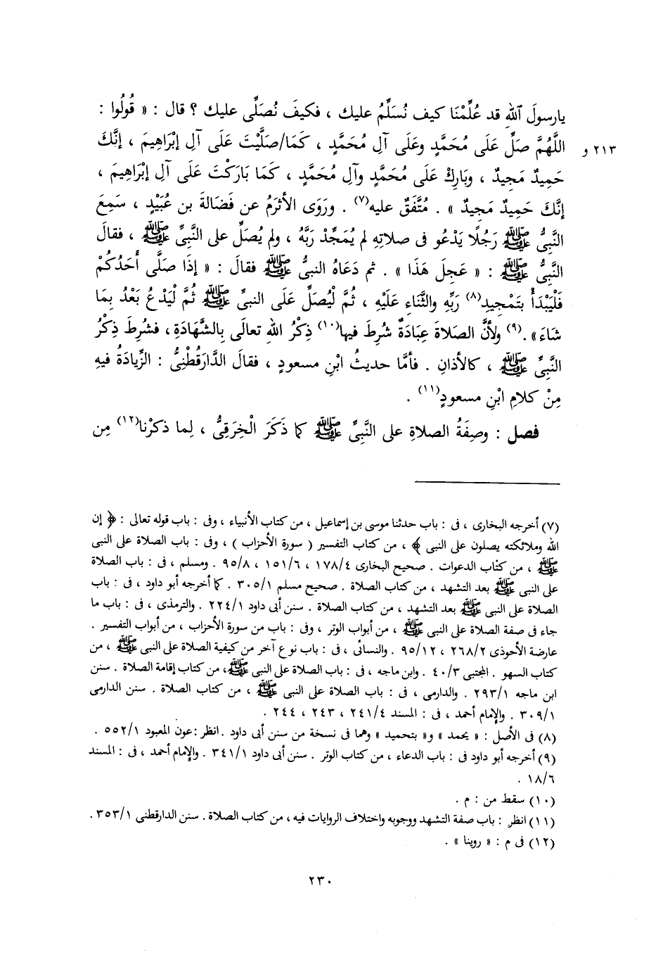 يا رسولَ اللهِ قد عُلِّمْنَا كيف نُسَلِّمُ عليك، فكيفَ نُصَلِّى عليك؟ قال: "قُولُوا: اللَّهُمَّ صَلِّ عَلَى مُحَمَّدٍ وعَلَى آلِ مُحَمَّدٍ، كَمَا صَلَّيْتَ عَلَى آلِ إبْرَاهِيمَ، إنَّكَ حَمِيدٌ مَجِيدٌ، وبَارِكْ عَلَى مُحَمَّدٍ وآلِ مُحَمَّدٍ، كَمَا بَارَكْتَ عَلَى آلِ إبْرَاهِيمَ، إنَّكَ حَمِيدٌ مَجِيدٌ". مُتَّفَقٌ عليه (٧). ورَوَى الأثرَمُ عن فَضَالةَ بن عُبَيْدٍ، سَمِعَ النَّبِىُّ -صلى اللَّه عليه وسلم- رَجُلًا يَدْعُو في صلاتِهِ لم يُمَجِّدْ رَبَّهُ، ولم يُصَلِّ على النَّبِيِّ -صلى اللَّه عليه وسلم-، فقالَ النَّبِىُّ -صلى اللَّه عليه وسلم-: "عَجِلَ هَذَا". ثم دَعَاهُ النبيُّ -صلى اللَّه عليه وسلم- فقالَ: "إذَا صَلَّى أَحَدُكُمْ فَلْيَبْدَأْ بتَمْجِيدِ (٨) رَبِّهِ والثَّنَاءِ عَلَيْهِ، ثُمَّ لْيُصَلِّ عَلَى النبيِّ -صلى اللَّه عليه وسلم- ثُمَّ لْيَدْعُ بَعْدُ بِمَا شَاءَ". (٩) ولأنَّ الصَلاةَ عِبَادَةٌ شُرِطَ فيها (١٠) ذِكْرُ اللهِ تعالَى بِالشَّهَادَةِ، فشُرِطَ ذِكْرُ النَّبِيِّ -صلى اللَّه عليه وسلم-، كالأذانِ. فأمَّا حديثُ ابْنِ مسعودٍ، فقالَ الدَّارَقُطْنِىُّ: الزِّيادَةُ فيهِ مِنْ كلامِ ابْنِ مسعودٍ (١١).