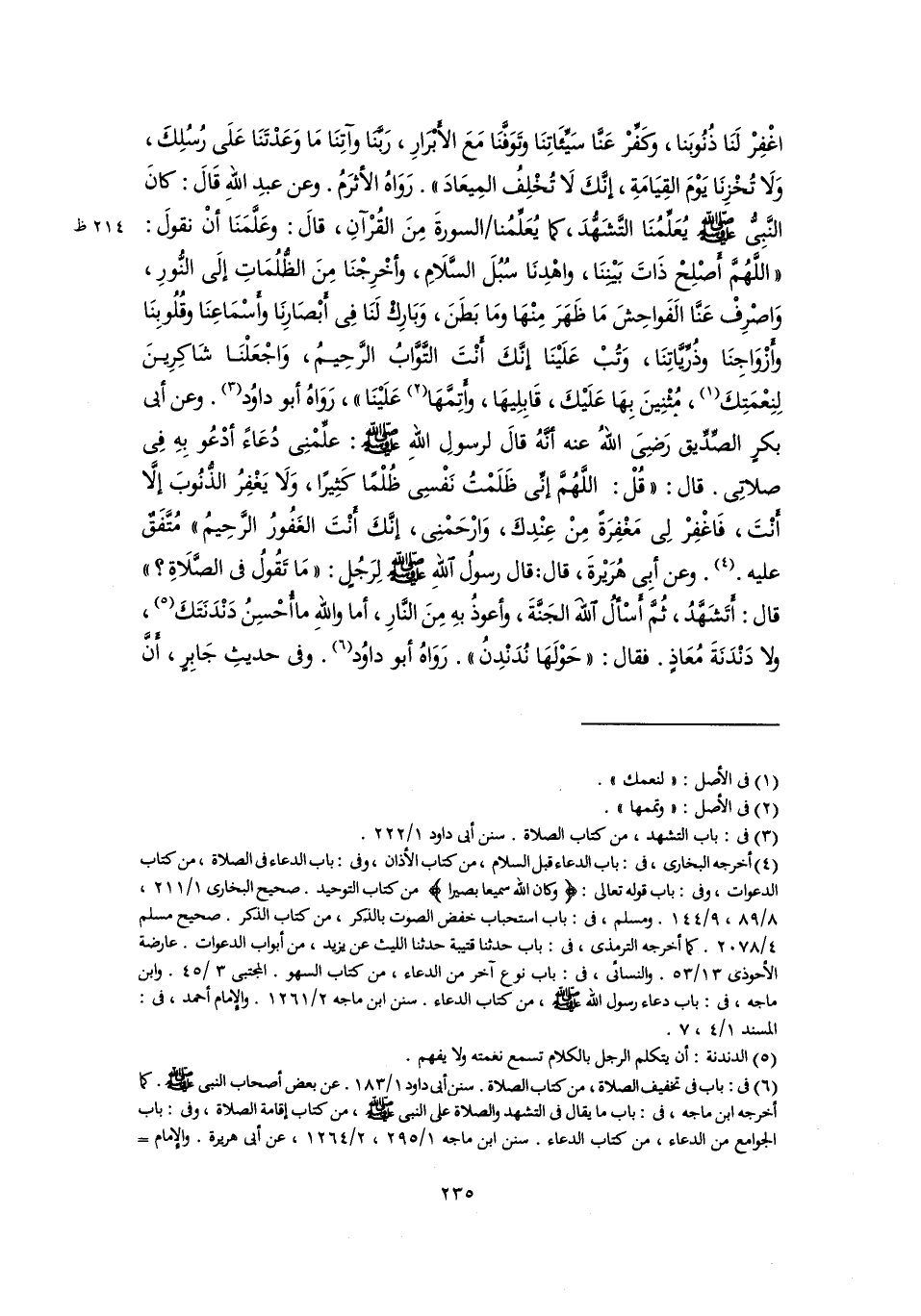 اغْفِرْ لَنَا ذُنُوبَنا، وكَفِّرْ عَنَّا سَيِّئَاتِنَا وتَوَفَّنَا مَعَ الأَبْرَارِ، رَبَّنَا وآتِنَا مَا وَعَدْتَنَا عَلَى رُسُلِكَ، وَلَا تُخْزِنَا يَوْمَ القِيَامَةِ، إنَّكَ لَا تُخْلِفُ المِيعَادَ". رَوَاهُ الأثرَمُ. وعن عبدِ اللهِ قَالَ: كانَ النَّبِيُّ -صلى اللَّه عليه وسلم- يُعَلِّمُنا التَّشَهُّدَ، كما يُعَلِّمُنا السورةَ مِنَ القُرْآنِ، قالَ: وعَلَّمَنَا أنْ نقولَ: "اللَّهُمَّ أَصْلِحْ ذَاتَ بَيْنِنَا، واهْدِنَا سُبُلَ السَّلَامِ، وأخْرِجْنَا مِنَ الظُّلُمَاتِ إلَى النُّورِ، وَاصْرِفْ عَنَّا الفَوَاحِشَ مَا ظَهَرَ مِنْهَا ومَا بَطَنَ، وَبَارِكْ لَنَا في أَبْصَارِنَا وأَسْمَاعِنَا وقُلُوبِنَا وأَزْوَاجِنَا وذُرِّيَّاتِنَا، وَتُبْ عَلَيْنَا إنَّكَ أَنْتَ التَّوَّابُ الرَّحِيمُ، وَاجْعَلْنَا شَاكِرِينَ لِنِعْمَتِكَ (١)، مُثْنِينَ بِهَا عَلَيْكَ، قَابِلِيهَا، وأَتِمَّهَا (٢) عَلَيْنَا"، رَوَاهُ أبو داوُد (٣). وعن أبي بكرٍ الصِّدِّيق رَضِىَ اللهُ عنه أنَّهُ قالَ لرسولِ اللهِ -صلى اللَّه عليه وسلم-: علِّمْنِى دُعَاءً أدْعُو بِهِ فِي صلاتِى. قال: "قُلْ: اللَّهُمَّ إنِّي ظَلَمْتُ نَفْسِى ظُلْمًا كَثِيرًا، وَلَا يَغْفِرُ الذُّنُوبَ إلَّا أَنْتَ، فَاغْفِرْ لِى مَغْفِرَةً مِنْ عِنْدِكَ، وَارْحَمْنِى، إنَّكَ أَنْتَ الغَفُورُ الرَّحِيمُ" مُتَّفَقٌ عليه. (٤). وعن أبِى هُرَيْرةَ، قال: قال رسولُ اللهِ -صلى اللَّه عليه وسلم- لِرَجُلٍ: "مَا تَقُولُ في الصَّلَاةِ؟ " قال: أَتَشَهَّدُ، ثُمَّ أَسْأَلُ اللهَ الجَنَّةَ، وأعوذُ بهِ مِنَ النَّارِ، أما واللهِ ما أُحْسِنُ دَنْدَنَتَكَ (٥)، ولا دَنْدَنَةَ مُعَاذٍ. فقال: "حَوْلَهَا نُدَنْدِنُ". رَوَاهُ أبو داوُد (٦). وفي حديثِ جَابِرٍ، أَنَّ