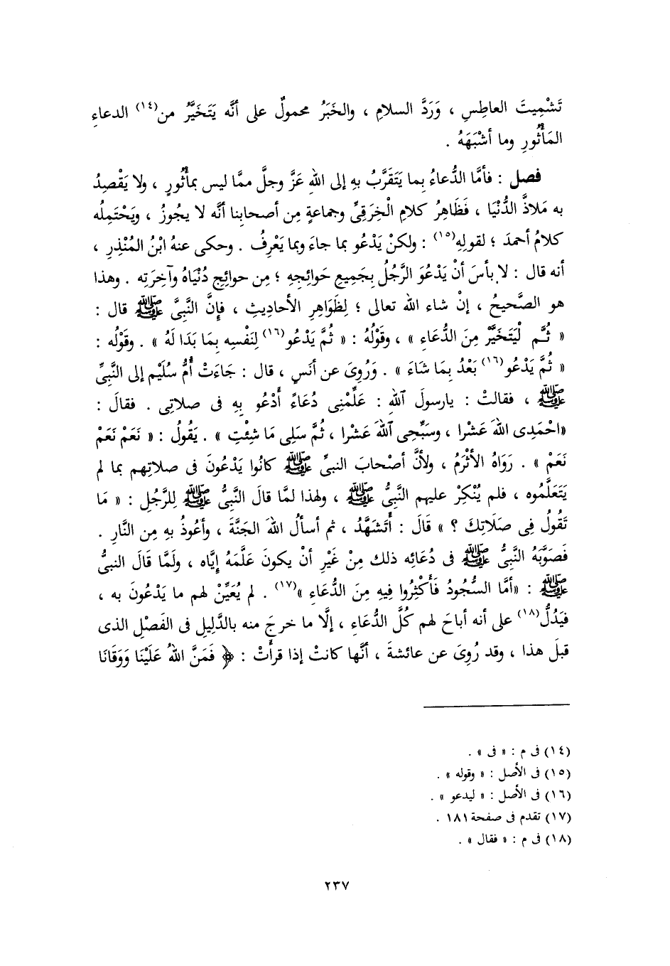 فصل: فأمَّا الدُّعاءُ بِما يَتَقَرَّبُ بهِ إلى اللَّه عَزَّ وجلَّ ممَّا ليس بمأْثُورٍ، ولا يَقْصِدُ به مَلاذَّ الدُّنْيَا، فَظَاهِرُ كلامِ الْخِرَقِىِّ وجماعةٍ مِن أصحابِنا أنَّه لا يجُوزُ، ويَحْتَمِلُه كلامُ أحمدَ؛ لقولِهِ (١٥): ولكنْ يَدْعُو بما جاءَ وبما يَعْرِفُ. وحكى عنهُ ابْنُ المُنْذِرِ، أنه قال: لا بأسَ أنْ يَدْعُوَ الرَّجُلُ بِجَمِيعِ حَوائِجِهِ؛ مِن حوائِجِ دُنْيَاهُ وآخِرَتِه. وهذا هو الصَّحيحُ، إنْ شاء اللَّه تعالى؛ لِظَوَاهِرِ الأحادِيثِ، فإِنَّ النَّبِيَّ -صلى اللَّه عليه وسلم- قال: "ثُمَّ لْيَتَخَيَّرْ مِنَ الدُّعَاءِ"، وقَوْلُهُ: "ثُمَّ يَدْعُو (١٦) لِنَفْسِه بِمَا بَدَا لَهُ". وقَوْلُه: "ثُمَّ يَدْعُو (١٦) بَعْدُ بِمَا شَاءَ". وَرُوِىَ عن أنَسٍ، قال: جَاءَتْ أُمُّ سُلَيْم إلى النَّبِيِّ -صلى اللَّه عليه وسلم-، فقالتْ: يا رسولَ اللهِ: عَلِّمْنِى دُعَاءً أَدعُو بِهِ في صلاتِى. فقالَ: "احْمَدِى اللهَ عَشْرا، وسَبِّحِى اللهَ عَشْرا، ثُمَّ سَلِى مَا شِئْتِ". يَقُولُ: "نَعَمْ نَعَمْ نَعَمْ". رَوَاهُ الأثْرَمُ، ولأنَّ أصْحابَ النبيِّ -صلى اللَّه عليه وسلم- كانُوا يَدْعُونَ في صلاتِهم بما لم يَتَعَلَّمُوه، فلم يُنْكِرْ عليهم النَّبِىُّ -صلى اللَّه عليه وسلم-، ولهذا لمَّا قالَ النَّبِيُّ -صلى اللَّه عليه وسلم- لِلرَّجُلِ: "مَا تَقُولُ فِي صَلَاتِكَ؟ " قَالَ: أَتَشَهَّدُ، ثم أسألُ اللهَ الجَنَّةَ، وأعُوذُ بهِ مِن النَّارِ. فَصَوَّبَهُ النَّبِيُّ -صلى اللَّه عليه وسلم- في دُعَائِه ذلك مِنْ غَيْرِ أنْ يكونَ عَلَّمَهُ إِيَّاه، ولَمَّا قَالَ النبيُّ -صلى اللَّه عليه وسلم-: "أمَّا السُّجُودُ فَأَكْثِرُوا فِيهِ مِنَ الدُّعَاءِ" (١٧). لم يُعَيِّنْ لهم ما يَدْعُونَ به، فيَدُلُّ (١٨) على أنه أباحَ لهم كُلَّ الدُّعَاءِ، إلَّا ما خرجَ منه بالدَّلِيلِ في الفَصْلِ الذي قبلَ هذا، وقد رُوِىَ عن عائشةَ، أنَّها كانتْ إذا قرأَتْ: {فَمَنَّ اللَّهُ عَلَيْنَا وَوَقَانَا