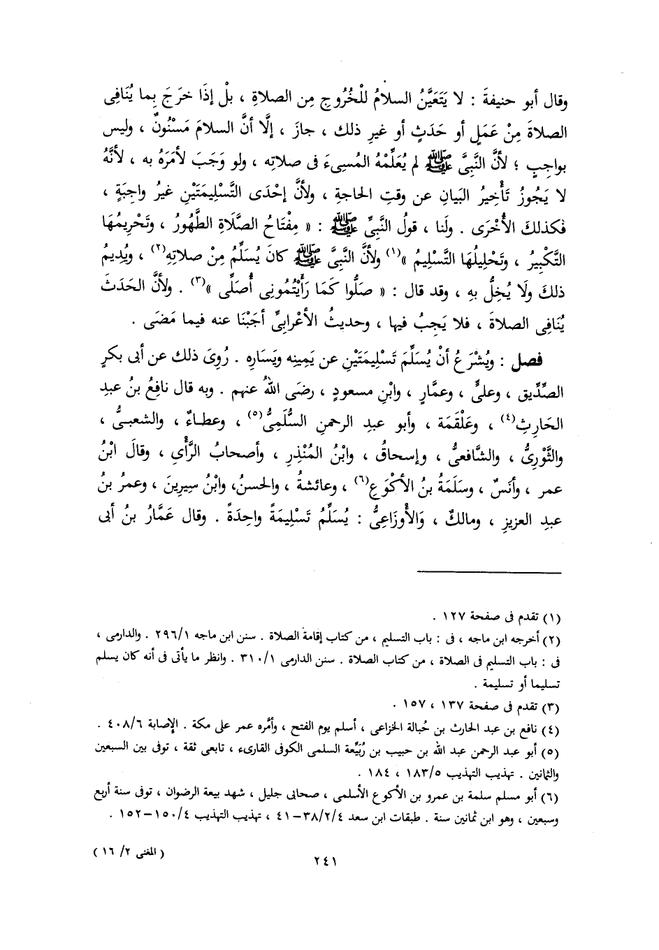 فصل: ويُشْرَعُ أنْ يُسَلِّمَ تَسْلِيمَتَيْنِ عن يَمِينِه ويَسَارِه. رُوِىَ ذلك عن أبي بكرٍ الصَّدِّيق، وعلىٍّ، وعمَّارٍ، وابْنِ مسعودٍ، رضىَ اللهُ عنهم. وبه قال نافِعُ بنُ عبدِ الحَارِثِ (٤)، وعَلْقَمَة، وأبو عبدِ الرحمنِ السُّلَمِىُّ (٥)، وعطاءٌ، والشعبىُّ، والثَّوْرِىُّ، والشَّافعىُّ، وإسحاقُ، وابْنُ المُنْذِرِ، وأصحابُ الرَّأْىِ، وقالَ ابْنُ عمر، وأنَسٌ، وسَلَمَةُ بنُ الأكْوَعِ (٦)، وعائشةُ، والحسنُ، وابْنُ سِيرِينَ، وعمرُ بنُ عبدِ العزيزِ، ومالكٌ، وَالأوزَاعِىُّ: يُسَلِّمُ تَسْلِيمَةً واحِدَةً. وقال عَمَّارُ بنُ أبى