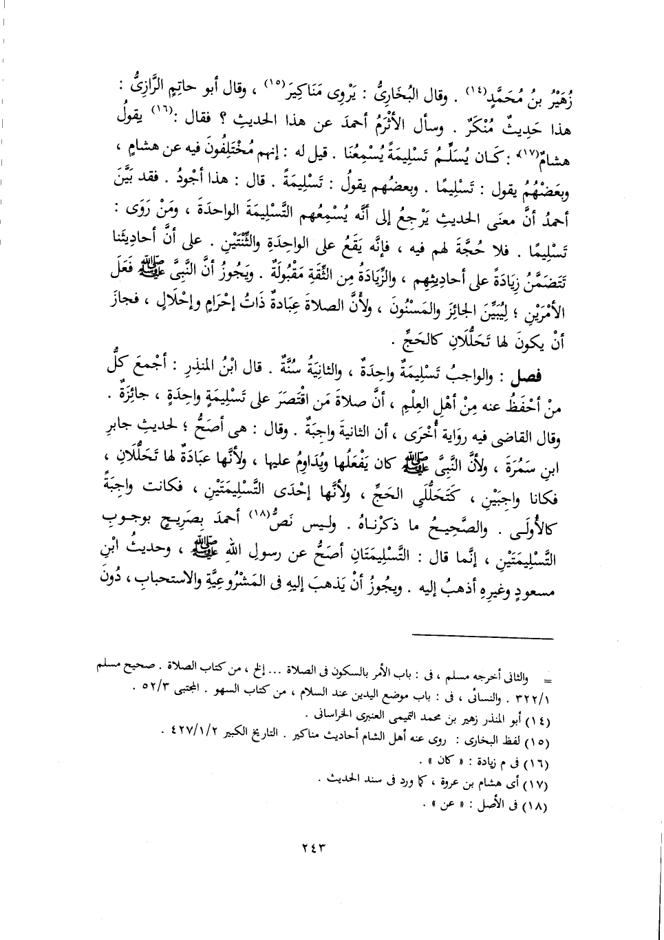 زُهَيْرُ بنُ مُحَمَّدٍ (١٤). وقال البُخَارِىُّ: يَرْوِى مَنَاكِيرَ (١٥)، وقال أبو حاتِمٍ الرَّازِيُّ: هذا حَدِيثٌ مُنْكَرٌ. وسأل الأثْرَمُ أحمدَ عن هذا الحديثِ؟ فقال: (١٦) يقولُ هشامٌ (١٧): كَان يُسَلِّمُ تَسْلِيمَةً يُسْمِعُنَا. قيل له: إنهم مُخْتَلِفُونَ فيه عن هشامٍ، وبَعْضُهُم يقول: تَسْلِيمًا. وبعضُهم يقولُ: تَسْلِيمَةً. قال: هذا أجْودُ. فقد بَيَّنَ أحمدُ أنَّ معنَى الحديثِ يَرْجِعُ إلى أنَّه يُسْمِعُهم التَّسْلِيمَةَ الواحدَةَ، ومَنْ رَوَى: تَسْلِيمًا. فلا حُجَّةَ لهم فيه، فإنَّه يَقَعُ على الواحِدَةِ والثِّنْتَيْنِ. على أنَّ أحادِيثَنا تَتَضَمَّنُ زِيَادَةً على أحادِيثِهِم، والزِّيَادَةُ مِن الثِّقَةِ مَقْبُولَةٌ. ويَجُوزُ أنَّ النَّبِىَّ -صلى اللَّه عليه وسلم- فَعَلَ الأمْرَيْنِ؛ لِيُبَيِّنَ الجائِزَ والمَسْنُونَ، ولأَنَّ الصلاةَ عِبَادةٌ ذَاتُ إحْرَامٍ وإحْلَالٍ، فجازَ أنْ يكونَ لها تَحَلُّلَانِ كالحَجِّ.