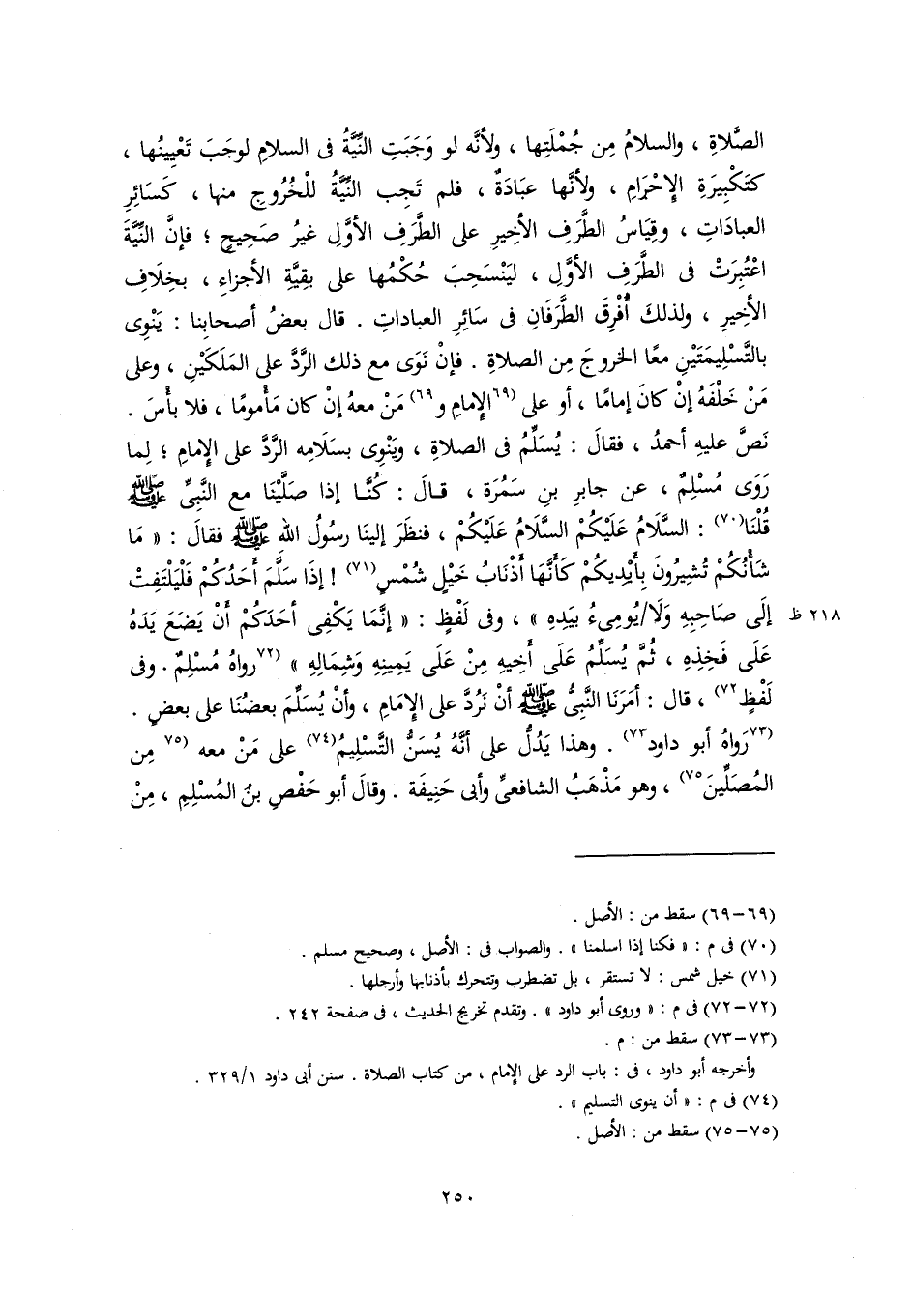 الصَّلاةِ، والسلامُ مِن جُمْلَتِها، ولأنَّه لو وَجَبَتِ النِّيَّةُ في السلامِ لوجَبَ تَعْيِينُها، كتَكْبِيرَةِ الإِحْرَامِ، ولأنَّها عبَادَةٌ، فلم تَجِب النِّيَّةُ للْخُرُوجِ منها، كَسَائِرِ العبادَاتِ، وقِيَاسُ الطَّرَفِ الأخِيرِ على الطَّرَفِ الأوَّلِ غيرُ صَحِيحٍ؛ فإنَّ النِّيَّةَ اعْتُبِرَتْ في الطَّرَفِ الأوَّلِ، ليَنْسَحِبَ حُكْمُها على بقِيَّةِ الأجزاءِ، بخِلَافِ الأخِيرِ، ولذلكَ أُفْرِقَ الطَّرَفَانِ في سَائِرِ العباداتِ. قال بعضُ أصحابِنا: يَنْوِى بالتَّسْلِيمَتَيْنِ معًا الخروجَ مِن الصلاةِ. فإنْ نَوَى مع ذلك الرَّدَّ على المَلَكَيْنِ، وعلى مَنْ خَلْفَهُ إنْ كانَ إمامًا، أو على [الإِمامَ و] (٦٩) مَنْ معهُ إنْ كان مَأْمومًا، فلا بأْسَ. نَصَّ عليهِ أحمدُ، فقالَ: يُسَلِّمُ في الصلاةِ، ويَنْوِى بسَلَامِه الرَّدَّ على الإِمامِ؛ لِما رَوَى مُسْلِمٌ، عن جابرِ بنِ سَمُرَة، قالَ: كُنَّا إذا صَلَّيْنَا مع النَّبِيِّ -صلى اللَّه عليه وسلم- قُلْنَا (٧٠): السَّلَامُ عَلَيْكُمْ السَّلَامُ عَلَيْكُمْ، فنظَرَ إلينَا رسُولُ اللهِ -صلى اللَّه عليه وسلم- فقالَ: "مَا شَأْنُكُمْ تُشِيرُونَ بِأَيْديكُمْ كَأَنَّهَا أَذْنَابُ خَيْلٍ شُمْسٍ (٧١)! إذَا سَلَّمَ أحَدُكُمْ فَلْيَلْتَفِتْ إلَى صَاحِبِهِ وَلَا يُومِىءُ بيَدِهِ"، وفى لَفْظٍ: "إنَّمَا يَكْفِى أَحَدَكُمْ أَنْ يَضَعَ يَدَهُ عَلَى فَخِذِهِ، ثُمَّ يُسَلِّمُ عَلَى أَخِيهِ مِنْ عَلَى يَمِينِهِ وَشِمَالِهِ" [رواهُ مُسْلِمٌ. وفى لَفْظٍ] (٧٢)، قال: أمَرَنَا النَّبِىُّ -صلى اللَّه عليه وسلم- أنْ نَرُدَّ على الإِمَامِ، وأنْ يُسَلِّمَ بعضُنَا على بعضٍ. [رَواهُ أبو داود] (٧٣). وهذا يَدُلُّ على أنَّهُ يُسَنُّ التَّسْلِيمُ (٧٤) على مَنْ معه [مِن المُصَلِّينَ] (٧٥)، وهو مَذْهَبُ الشافعيِّ وأبي حَنِيفَة. وقالَ أبو حَفْصِ بْنُ المُسْلِمِ، مِنْ