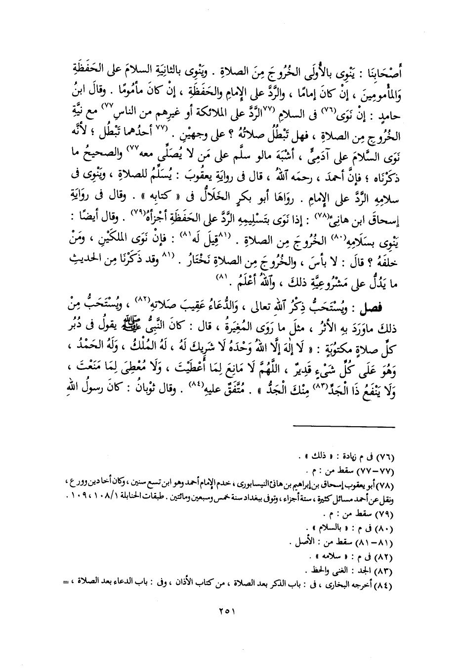 فصل: ويُسْتَحَبُّ ذِكْرُ اللهِ تعالى، وَالدُّعَاءُ عَقِيبَ صَلاتهِ (٨٢)، ويُسْتَحَبُّ مِنْ ذلكَ ما وَرَدَ بهِ الأثرُ، مثلَ ما رَوَى المُغِيرَةُ، قال: كانَ النَّبِىُّ -صلى اللَّه عليه وسلم- يقولُ في دُبُر كلِّ صلاةٍ مكتُوبَةٍ: "لَا إلهَ إلَّا اللهُ وَحْدَهُ لَا شَريكَ لَهُ، لَهُ المُلْكُ، وَلَهُ الحَمْدُ، وَهُوَ عَلَى كُلِّ شَىْءٍ قَدِيرٌ، اللَّهُمَّ لَا مَانِعَ لِمَا أَعْطَيْتَ، وَلَا مُعْطِىَ لِمَا مَنَعْتَ، وَلَا يَنْفَعُ ذَا الْجَدِّ (٨٣) مِنْكَ الْجَدُّ". مُتَّفَقٌ عليهِ (٨٤). وقال ثوْبانُ: كانَ رسولُ اللهِ