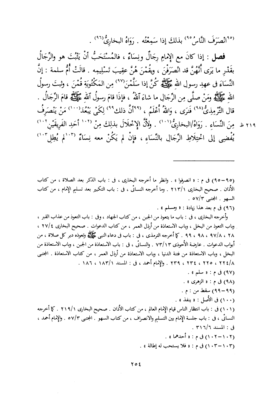 فصل: إذا كانَ مع الإِمامِ رجَالٌ ونِسَاءٌ، فالمُسْتَحَبُّ أنْ يَثْبُتَ هو والرِّجَالُ بقَدْرِ ما يَرَى أَنَّهُنَّ قد انْصَرَفْنَ، ويقُمْنَ هُنَّ عقِيبَ تَسْلِيمِه. قالَتْ أُمُّ سَلَمَة: إنَّ النِّسَاءَ في عهدِ رسولِ اللهِ -صلى اللَّه عليه وسلم- كُنَّ إذا سَلَّمْنَ (٩٧) مِن المَكْتُوبَةِ قُمْنَ، وثبتَ رسولُ اللهِ -صلى اللَّه عليه وسلم- ومَنْ صلَّى مِن الرِّجَالِ ما شاءَ اللهُ، فإذَا قامَ رسولُ اللهِ -صلى اللَّه عليه وسلم- قامَ الرِّجَالُ. قال التِّرْمِذِىُّ (٩٨) فَنرَى، وَاللهُ أَعْلَمُ، [أنَّ ذلك] (٩٩) لِكَىْ يَبْعُدَ (١٠٠) مَنْ يَنْصَرِفُ مِنَ النِّسَاءِ. رَوَاهُ البخارِىُّ (١٠١). ولأنَّ الإِخْلَالَ بذلِكَ مِنْ [أحَدِ الفَرِيقَيْنِ] (١٠٢) يُفْضِى إلى اخْتِلَاطِ الرِّجَالِ بالنِّسَاءِ، فإِنْ لم يَكُنْ معه نِسَاءٌ [لم يُطِلِ] (١٠٣)