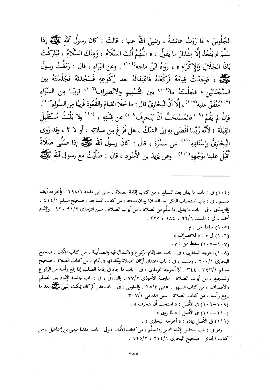 الجُلُوسَ؛ لما رَوَتْ عائشةُ، رضِىَ اللهُ عنها، قالتْ: كان رسولُ اللهِ -صلى اللَّه عليه وسلم- إذا سَلَّمَ لم يَقْعُدْ إلَّا مِقْدَارَ ما يقولُ: "اللَّهُمَّ أَنْتَ السَّلَامُ، وَمِنْكَ السَّلَامُ، تَبَارَكْتَ يَاذَا الجَلَالِ وَالإِكْرَامِ"، رَوَاهُ ابْنُ ماجه (١٠٤). وعن البَرَاءِ، قال: رَمَقْتُ رسولَ -صلى اللَّه عليه وسلم-، فوجَدْتُ قِيامَهُ فَرَكْعَتَهُ فَاعْتِدَالَهُ بعد رُكُوعِهِ فَسَجْدَتَهُ فجَلْسَتَهُ بين السَّجْدَتَيْنِ؛ فجَلْسَتَهُ ما (١٠٥) بين التَّسْلِيمِ والانْصِرافِ (١٠٦) قريبًا مِن السَّوَاءِ [مُتَّفَقٌ عليه (١٠٧)، إِلَّا أنَّ البُخَارِىَّ قال: ما خَلَا القيامَ والقُعُودَ قَرِيبًا مِن السَّواءِ] (١٠٨). فإنْ لم يَقُمْ [فالمُسْتَحَبُّ أنْ يَنْحَرِفَ] (١٠٩) عن قِبْلَتِهِ، [ولا يَلْبَثُ مُسْتَقْبِلَ القِبْلَةِ؛ لأنَّه رُبَّمَا أفْضَى بهِ إلى الشَّكِّ، هل فَرَغَ مِن صلاتِه، أو لا؟ ، وقد رَوَى البُخَارِىُّ بإسْنَادِهِ] (١١٠) عن سَمُرَةَ، قالَ: كانَ رسولُ اللَّه -صلى اللَّه عليه وسلم- إذا صَلَّى صَلَاةً أَقْبَلَ علينا بوَجْهِهِ (١١١). وعن يَزيدَ بن الأسْوَدِ، قال: صَلَّيْتُ مع رسولِ اللهِ -صلى اللَّه عليه وسلم-
