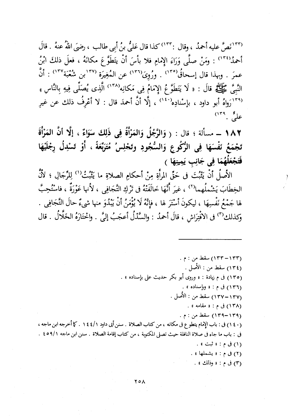 [نَصَّ عليه أحمدُ، وقال: ] (١٣٣) كذا قال عَلىُّ بنُ أبِى طالب، رضِيَ اللهُ عنهُ. قالَ أحمدُ (١٣٤): ومَنْ صلَّى وَرَاءَ الإِمامِ فلا بأسَ أنْ يتَطَوَّعَ مكانَهُ، فعلَ ذلكَ ابْنُ عمرَ. وبهذا قال إسحاقُ (١٣٥). ورُوِىَ (١٣٦) عن المُغِيرَة [بن شُعْبَة] (١٣٧): أنَّ النَّبِىَّ -صلى اللَّه عليه وسلم- قالَ: "لَا يَتَطوَّعُ الإِمَامُ في مَكانِه (١٣٨) الَّذِى يُصَلِّى فِيهِ بِالنَّاسِ" [رَواهُ أبو داود، بإسْنادِه (١٣٩)، إلَّا أنَّ أحمدَ قال: لا أعْرِفُ ذلك عن غيرِ عليٍّ]. (١٤٠).