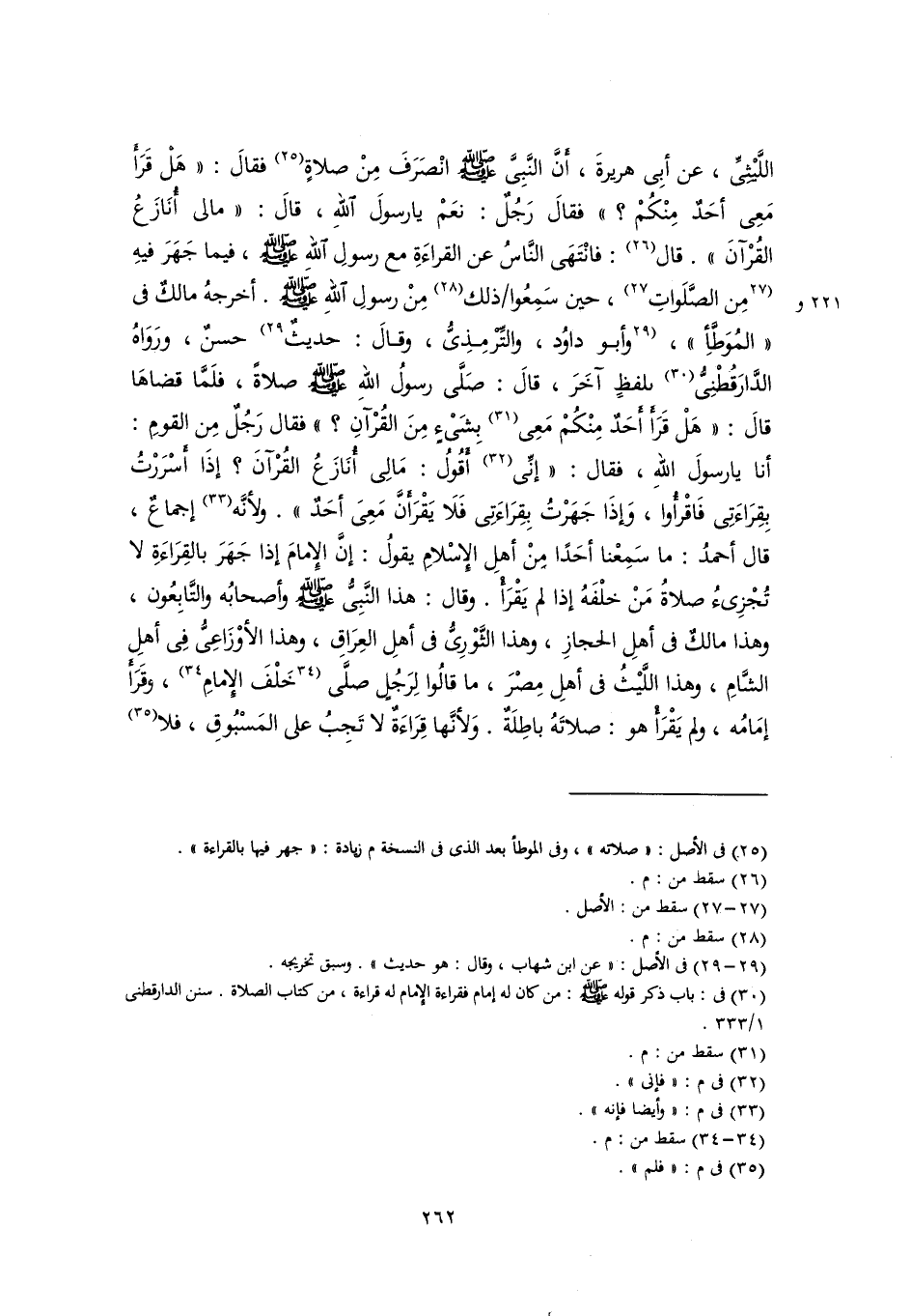 اللَّيْثِيِّ، عن أبِى هريرةَ، أَنَّ النَّبِيَّ -صلى اللَّه عليه وسلم- انْصَرَفَ مِنْ صلاةٍ (٢٥) فقالَ: "هَلْ قَرَأَ مَعِى أحَدٌ مِنْكُمْ؟ " فقالَ رَجُلٌ: نعَمْ يا رسولَ اللهِ، قالَ: "مالى أُنَازَعُ القُرْآنَ". قال (٢٦): فانْتَهَى النَّاسُ عن القراءَةِ مع رسولِ اللهِ -صلى اللَّه عليه وسلم-، فيما جَهَرَ فيهِ [مِن الصَّلَواتِ] (٢٧)، حين سَمِعُوا ذلك (٢٨) مِنْ رسولِ اللهِ -صلى اللَّه عليه وسلم-. أخرجهُ مالكٌ في "المُوَطَّإِ"، [وأبو داوُد، والتِّرْمِذِىُّ، وقالَ: حديثٌ] (٢٩) حسنٌ، ورَوَاهُ الدَّارَقُطْنِيُّ (٣٠) بلفظٍ آخَرَ، قالَ: صَلَّى رسولُ اللهِ -صلى اللَّه عليه وسلم- صلاةً، فلَمَّا قضاهَا قالَ: "هَلْ قَرَأَ أَحَدٌ مِنْكُمْ مَعِى (٣١) بِشَىْءٍ مِنَ القُرآنِ؟ " فقال رَجُلٌ مِن القومِ: أنا يا رسولَ اللهِ، فقال: "إنِّي (٣٢) أَقُولُ: مَالِى أُنَازَعُ القُرْآنَ؟ إذَا أَسْرَرْتُ بِقِرَاءَتِى فَاقْرأُوا، وَإذَا جَهَرْتُ بِقِرَاءَتِى فَلَا يَقْرَأَنَّ مَعِىَ أحَدٌ". ولأنَّه (٣٣) إجماعٌ، قال أحمدُ: ما سَمِعْنا أحَدًا مِنْ أهلِ الإِسْلامِ يقولُ: إنَّ الإِمامَ إذا جَهَرَ بالقِرَاءَةِ لا تُجْزِىءُ صلاةُ مَنْ خلْفَهُ إذا لم يَقْرَأْ. وقال: هذا النَّبِيُّ -صلى اللَّه عليه وسلم- وأصحابُه والتَّابِعُون، وهذا مالكٌ في أهلِ الحجازِ، وهذا الثَّوْرِيُّ في أهلِ العِرَاقِ، وهذا الأوْزَاعِيُّ في أهلِ الشَّامِ، وهذا اللَّيْثُ في أهلِ مِصْرَ، ما قالُوا لِرَجُلٍ صلَّى [خَلْفَ الإِمامِ] (٣٤)، وقَرَأَ إمَامُه، ولم يَقْرَأْ هو: صلاتَهُ باطِلَةٌ. وَلأنَّها قِرَاءَةٌ لا تَجِبُ على المَسْبُوقِ، فلا (٣٥)