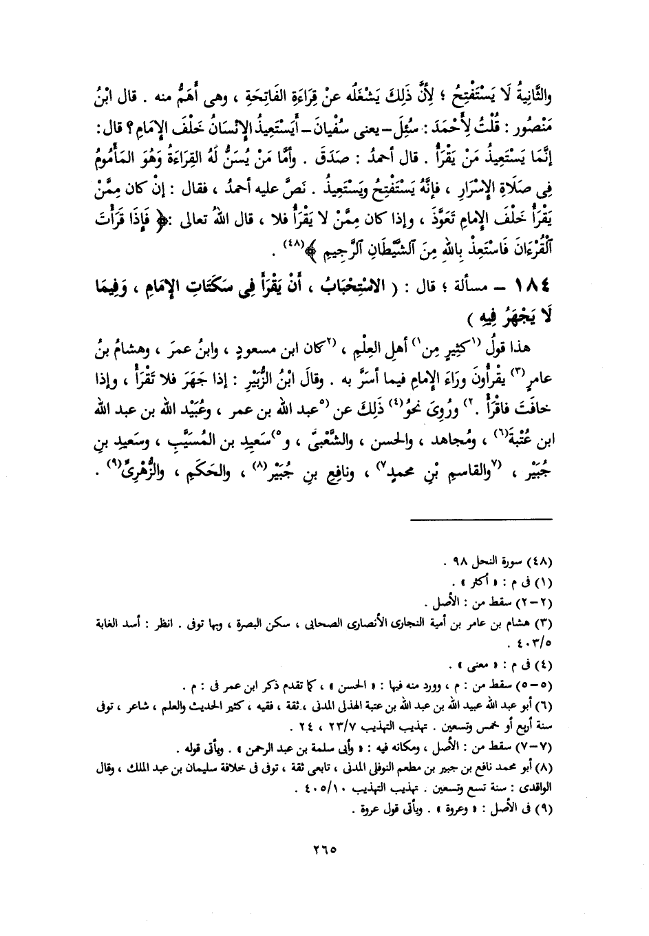 ١٨٤ - مسألة؛ قال: (الاسْتِحْبَابُ، أَنْ يَقْرَأَ في سَكَتَاتِ الإِمَامِ، وَفِيمَا لَا يَجْهَرُ فِيهِ)