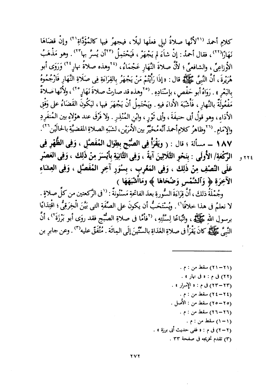 ١٨٧ - مسألة؛ قال: (ويَقْرَأُ في الصُّبْحِ بِطِوَالِ المُفَصَّلِ، وَفِى الظُّهْرِ فِي الرَّكْعَةِ الأُولَى: بِنَحْوِ الثَّلَاثِينَ آيةً، وَفِى الثَّانِيَةِ بِأيْسَرَ مِنْ ذَلِكَ، وَفِى العَصْرِ عَلَى النِّصْفِ مِنْ ذَلِكَ، وَفِى المَغْرِب، بِسُوَرِ آخِرِ المُفَصَّلِ، وَفِى العِشَاءِ الآخِرَةِ {وَالشَّمْسِ وَضُحَاهَا} ومَا أَشْبَهَهَا).