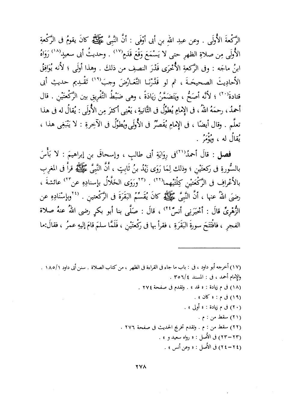 الرَّكْعةَ الأُولَى. وعن عبدِ اللهِ بنِ أبي أوْفَى: أنَّ النَّبِىَّ -صلى اللَّه عليه وسلم- كانَ يقومُ في الرَّكْعةِ الأُولَى مِن صلاةِ الظهرِ حتى لا يَسْمَعَ وَقعَ قَدَمٍ (١٧). وحديثُ أبى سعيدٍ (١٨) رَوَاهُ ابنُ ماجَه: وفى الرَّكعةِ الأُخْرَى قَدْرَ النصفِ من ذلكَ. وهذا أولَى؛ لأنه يُوَافِقُ الأحادِيثَ الصحيحَةَ، ثم لو قَدَّرْنَا التَّعَارُضَ وجبَ (١٩) تَقْدِيم حديثِ أبى قتادةَ (٢٠)؛ لأنَّه أصَحُّ، ويَتَضَمَّنُ زيَادَةً، وهى ضَبْطُ التَّفْرِيقِ بين الرَّكْعتَيْنِ. قال أحمدُ، رحمَهُ اللهُ، في الإِمامِ يُطوِّلُ في الثَّانيةِ، يَعْنِى أكثرَ مِن الأُولَى: يُقالُ له في هذا تعلَّم. وقال أيضًا، في الإِمامِ يُقَصِّرُ في الأُولَى ويُطوِّلُ في الآخِرةِ: لا يَنْبَغِى هذا، يُقالُ له، ويُؤْمَرُ.
