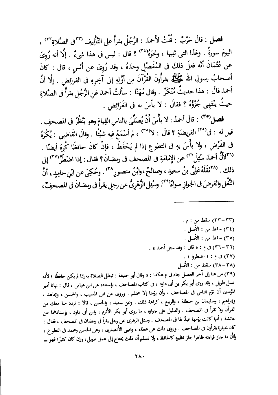 فصل: قالَ حَرْبٌ: قُلْتُ لأحمدَ: الرَّجُلُ يقرأُ على التَّأْلِيفِ [في الصَّلاةِ] (٣٣)، اليومَ سورةً. وغدًا التي تَلِيها، ونحوَهُ (٣٤)؟ قال: ليس في هذا شيءٌ. إلَّا أنه رُوِىَ عن عُثْمَانَ أنَّه فعلَ ذلكَ في المُفَصَّلِ وحدَهُ، وقد رُوِىَ عن أنَسٍ، قال: كانَ أصحابُ رسولِ اللَّه -صلى اللَّه عليه وسلم- يقرأُونَ القُرْآنَ مِن أوَّلِهِ إلى آخِرِهِ في الفرائِضِ. إلَّا أنَّ أحمدَ قالَ: هذا حديثٌ مُنْكَرٌ. وقال مُهَنَّا: سألتُ أحمدَ عَنِ الرَّجُلِ يقرأُ في الصَّلاةِ حيثُ ينْتَهِى جُزْؤُهُ؟ فقالَ: لا بأسَ به في الفَرَائِضِ.