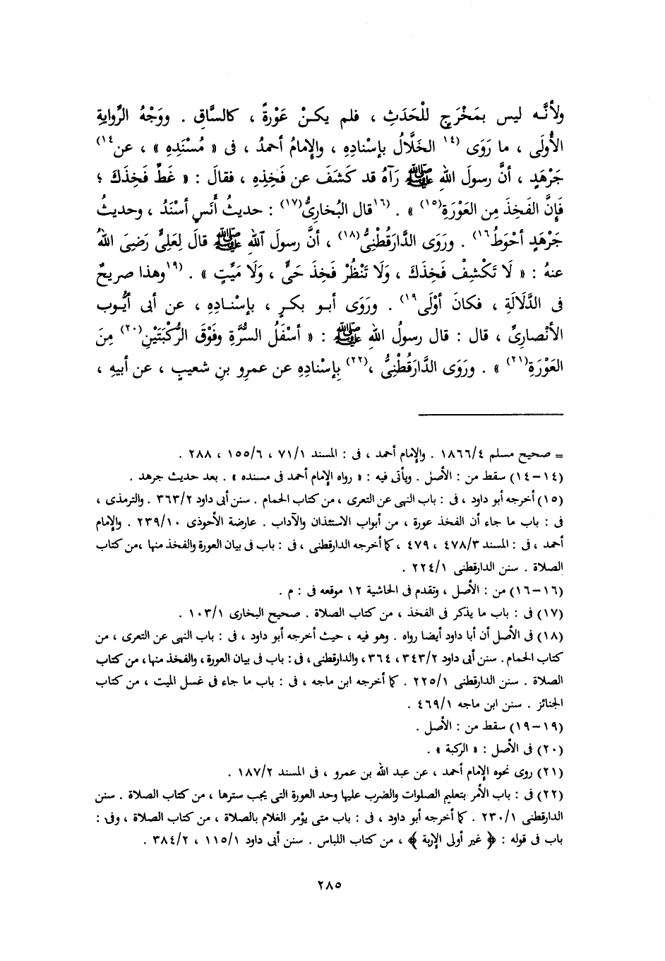 (١٥) أخرجه أبو داود، في: باب النهى عن التعرى، من كتاب الحمام. سنن أبي داود ٢/ ٣٦٣. والترمذي، في: باب ما جاء أن الفخذ عورة، من أبواب الاستئذان والآداب. عارضة الأحوذى ١٠/ ٢٣٩. والإمام أحمد، في: المسند ٣/ ٤٧٨، ٤٧٩، كما أخرجه الدارقطني، في: باب في بيان العورة والفخذ منها، من كتاب الصلاة. سنن الدارقطني ١/ ٢٢٤.