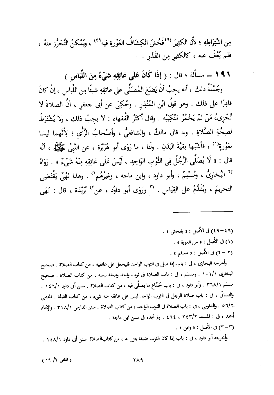 ١٩١ - مسألة؛ قال: (إذَا كَانَ عَلَى عَاتِقِهِ شَىْءٌ مِنَ اللِّبَاسِ)