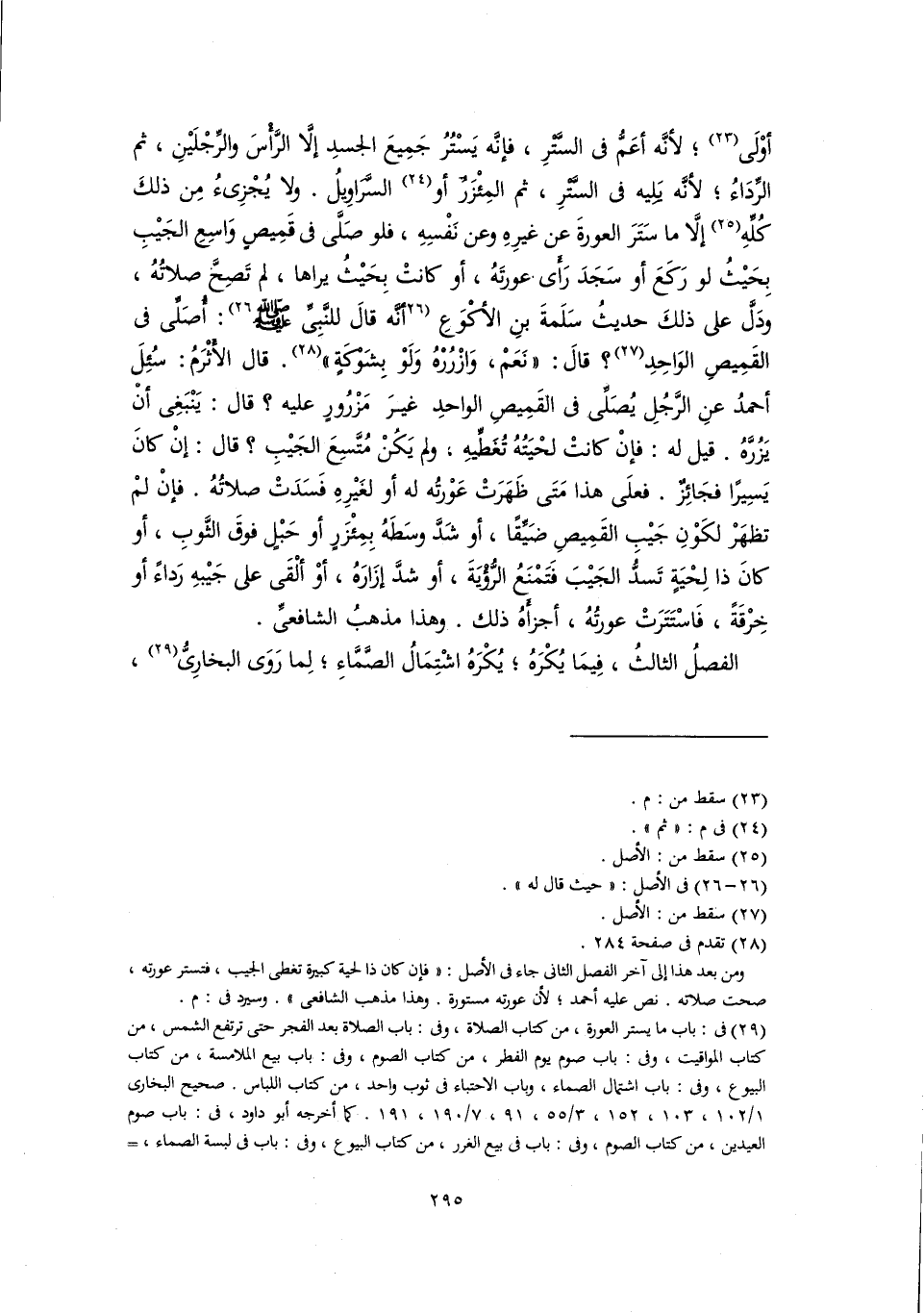 الفصلُ الثالثُ، فِيمَا يُكْرَهُ؛ يُكْرَهُ اشْتِمَالُ الصَّمَّاءِ؛ لِما رَوَى البخارِيُّ (٢٩)،