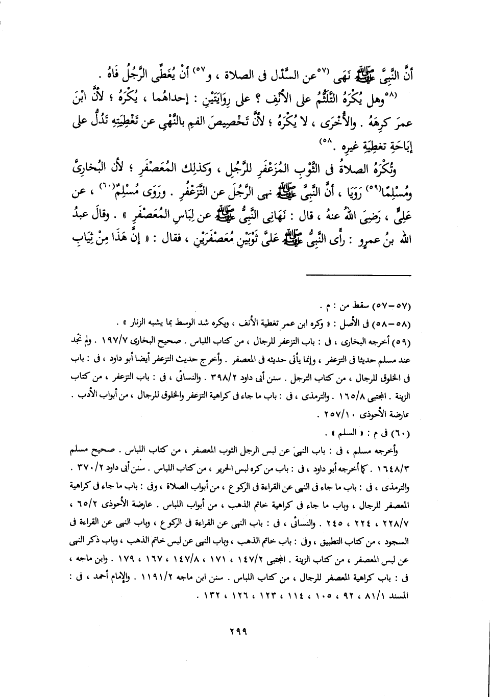 وتُكْرَهُ الصلاةُ في الثَّوْبِ المُزَعْفَرِ للرَّجُلِ، وكذلِك المُعَصْفَرِ؛ لأن البُخارِيَّ ومُسْلِمًا (٥٩) رَوَيَا، أنَّ النَّبِيَّ -صلى اللَّه عليه وسلم- نهى الرَّجُلَ عن التَّزَعْفُرِ. ورَوَى مُسْلِمٌ (٦٠)، عن عَلِيٍّ، رَضِىَ اللهُ عنهُ، قال: نَهَانِى النَّبِيُّ -صلى اللَّه عليه وسلم- عن لِبَاسِ المُعَصْفَرِ". وقالَ عبدُ اللَّه بنُ عمرٍو: رأَى النَّبِيُّ -صلى اللَّه عليه وسلم- عَليَّ ثَوْبَيْنِ مُعَصْفَرَيْنِ، فقال: "إنَّ هَذَا مِنْ ثِيَابِ