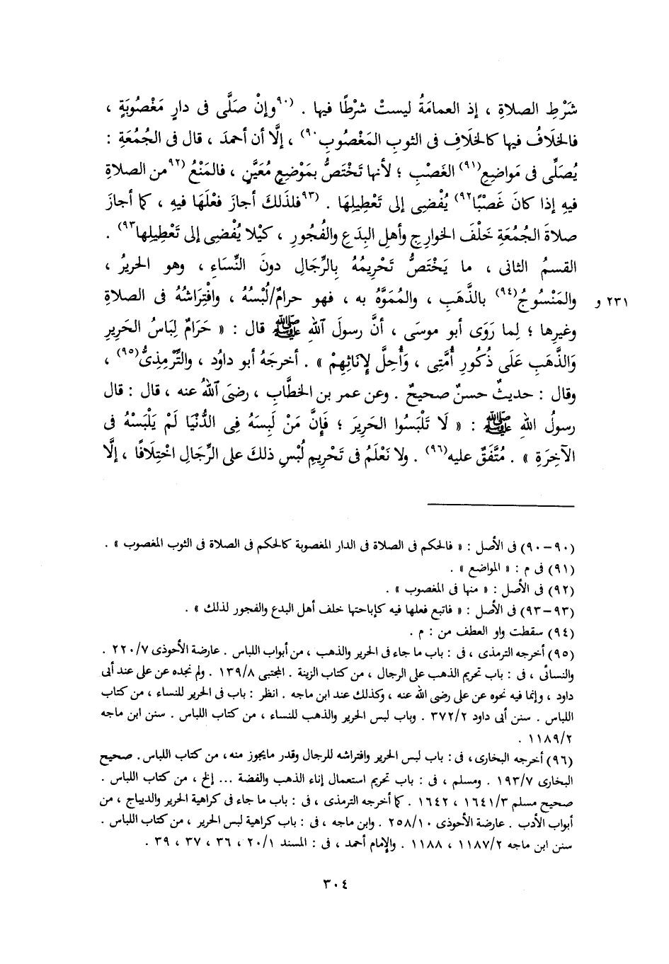 شَرْطِ الصلاةِ، إذ العمامَةُ ليستْ شرْطًا فيها. [وإنْ صَلَّى في دارٍ مَغْصُوبَةٍ، فالخلَافُ فيها كالخلَافِ في الثوبِ المَغْصُوبِ] (٩٠)، إلَّا أن أحمدَ، قال في الجُمُعَةِ: يُصَلِّى في مَواضِعِ (٩١) الغَصْبِ؛ لأنها تَخْتَصُّ بمَوْضِعٍ مُعَيَّنٍ، فالمَنْعُ [من الصلاةِ فيهِ إذا كانَ غَصْبًا] (٩٢) يُفْضِى إلى تَعْطِيلِهَا. [فلذَلكَ أجازَ فعْلَهَا فيهِ، كما أجازَ صلاةَ الجُمُعَةِ خَلْفَ الخوارِجِ وأهلِ البِدَعِ والفُجُورِ، كيْلا يُفْضِى إلى تَعْطِيلِها] (٩٣). القسمُ الثاني، ما يَخْتَصُّ تَحْرِيمُهُ بِالرِّجَالِ دونَ النِّسَاءِ، وهو الحريرُ، والمَنْسُوجُ (٩٤) بالذَّهَبِ، والمُمَوَّهُ به، فهو حرامٌ لُبْسُهُ، وافْتِرَاشُهُ في الصلاةِ وغيرِها؛ لِما رَوَى أبو موسَى، أنَّ رسولَ اللهِ -صلى اللَّه عليه وسلم- قال: "حَرَامٌ لِبَاسُ الحَرِيرِ وَالذَّهَبِ عَلَى ذُكُورِ أُمَّتِى، وَأُحِلَّ لإِنَاثِهِمْ". أخرجَهُ أبو داوُد، والتِّرْمِذِيُّ (٩٥)، وقال: حديثٌ حسنٌ صحيحٌ. وعن عمر بن الخطَّابِ، رضيَ اللهُ عنه، قال: قال رسولُ اللهِ -صلى اللَّه عليه وسلم-: "لَا تَلْبَسُوا الحَرِيرَ؛ فَإِنَّ مَنْ لَبِسَهُ في الدُّنيا لَمْ يَلْبَسْهُ في الآخِرَةِ". مُتَّفَقٌ عليه (٩٦). ولا نَعْلَمُ في تَحْرِيمِ لُبْسِ ذلكَ على الرِّجَالِ اخْتِلَافًا، إلَّا